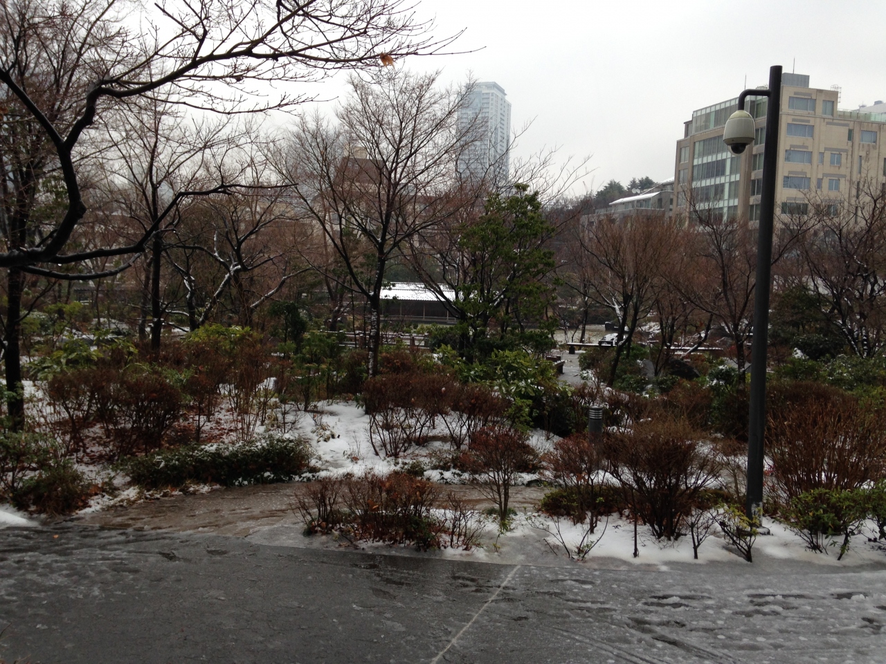 小川があり途中で段差があるので小さな滝の様でした。花の案内板があったので季節によってはお花もきれいなようです。また入り口の椿の赤い花に雪がかかって風情がありました。この後TBSに行ったのですが、凄い近くでした。