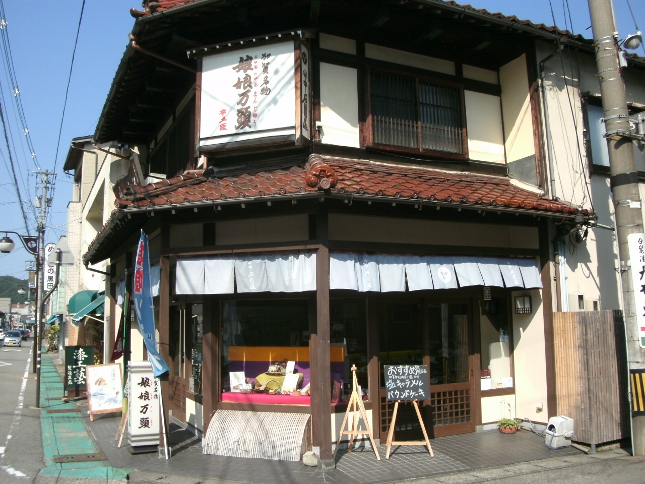 「山中石川屋」さんは、山中温泉街のど真ん中にあります。山中温泉街を歩いていると『娘娘万頭(にゃあにゃあまんじゅう)』と書かれ看板が沢山あがっています。この猫の鳴き声のような変わった名前の饅頭を販売されている元祖のお店です。