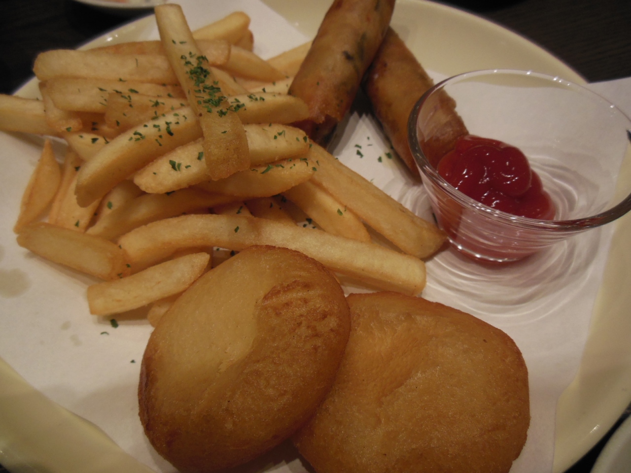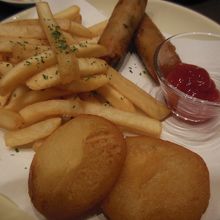揚げ物三種→おつまみにちょうど良い。丸いチーズな揚げ物がワインに◎