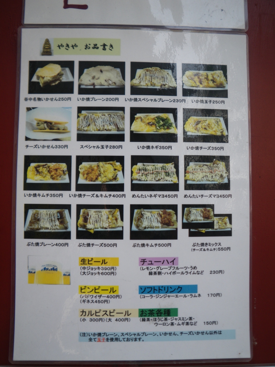 夕やけだんだんを降りきった、谷中銀座商店街の入口にあるお店です。大阪のソウルフードいか焼きが名物。運良くいつもの行列がないので、いそいでいかせん(250円)を注文!注文を受けてから作ってくれます。えびせんに挟まったあつあつのいか焼き、美味し!並ばずに買えるなら、毎度買いたいなぁ~・笑