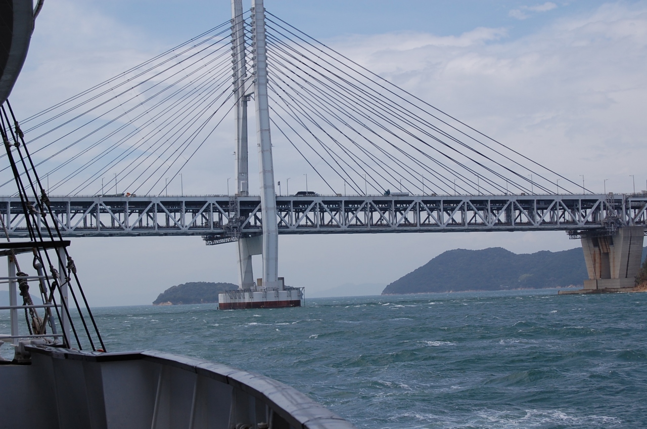 坂出方面から瀬戸大橋に入り、与島PAで降りて、瀬戸大橋観光船に乗船した。当日は、晴天だったがとても風が強く観光船の出発が危ぶまれたが、ほぼ予定通り出港してくれた。少し揺れる時もあったが全体としては全く大丈夫だった。そして何より瀬戸大橋の雄大な景観や、橋脚付近の様子や瀬戸大橋を真下から見るなど、海面からでなければ見られない絶妙な風景を様々なポイントから眺めることができた。とても楽しいクルージングだった。