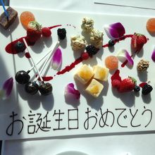 お誕生日ランチに行ったら素敵なデザートプレート(写真)をデザートとは別にいただきました、他の席でも記念日のプレートが出ていたのを見ると何種類かあるようです。激寒の日に行きましたが窓側の席はのぼせるので脱ぎ着のしやすい服(セーターよりカーデガン)で行くのがお薦めです。