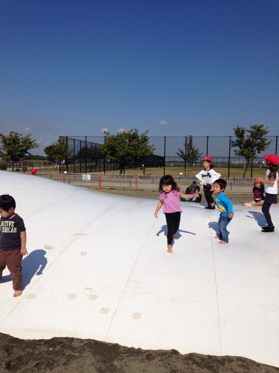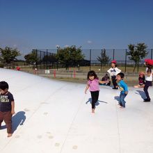 白い大きなエアトランポリン?があり大人も子供と一緒にジャンプしてあそべます。