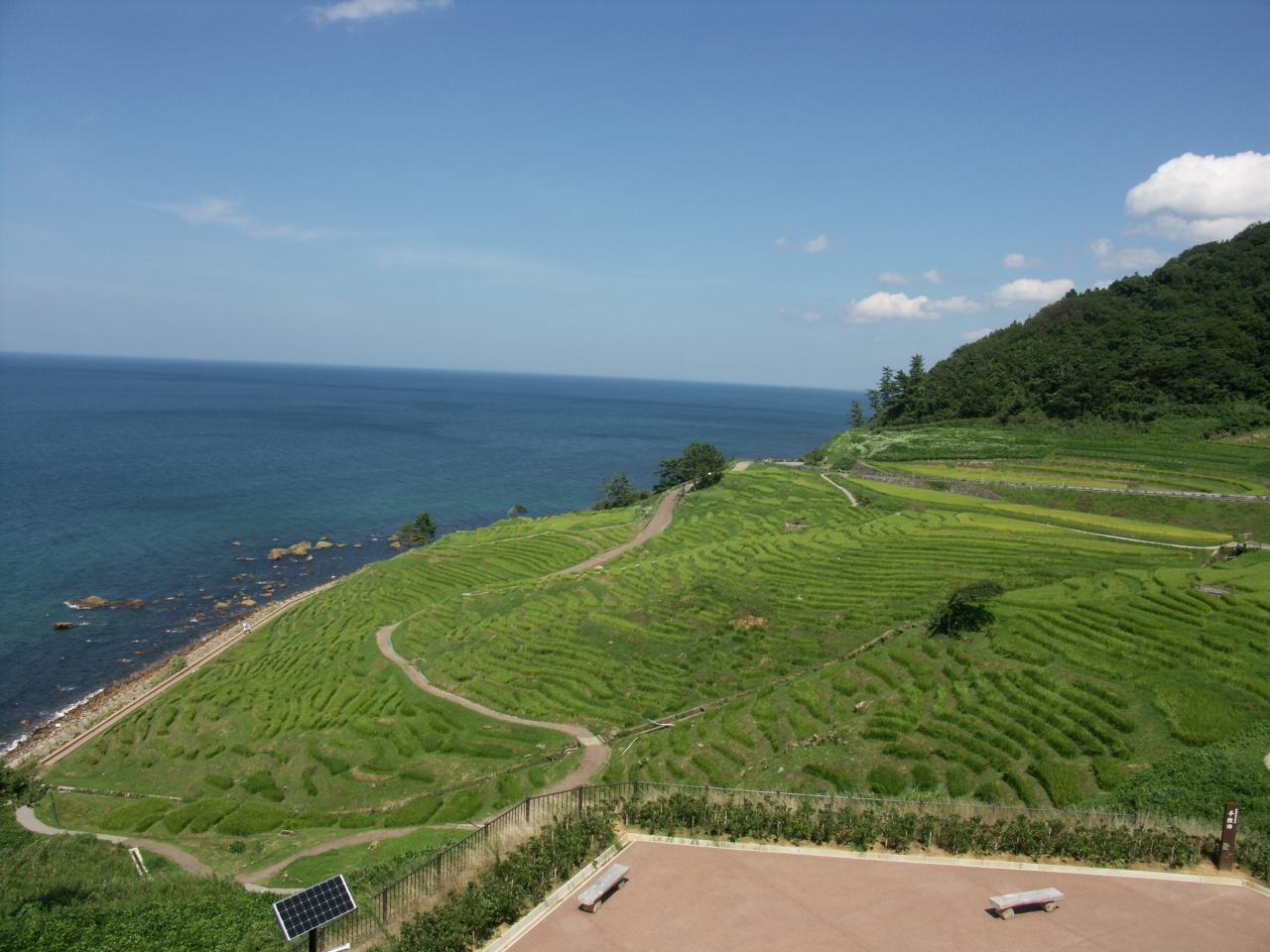 道の駅に隣接し、見事な景観を見せる。ほとんどの人は、駐車場から眺めるだけだが、千枚田の中の歩道を一周することができる。道の駅は、海岸からかなりの高所にあるが、千枚田は海岸近くまで広がっている。オーナー制度があり、農作業に参加し、収穫することもできる。