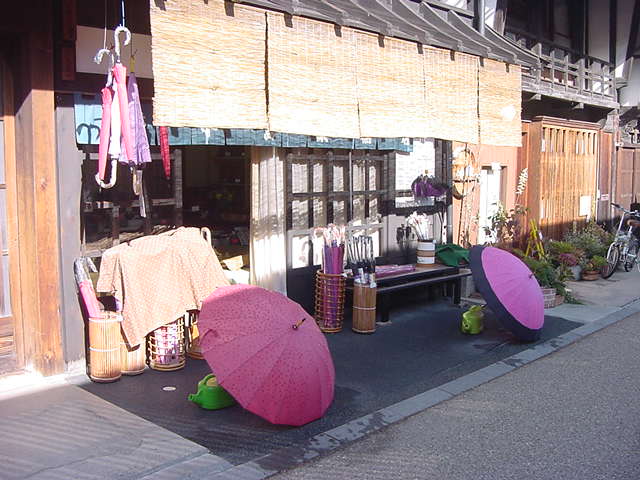 木曽路の中でも人気の観光地である奈良井宿の中にあるお土産店です。漆器を中心に扱っていますが、店内も古い建物の雰囲気がいいです。晴れているのに、なぜか店頭では傘が並んでいました。濡れると模様が出てくる傘だというのですが、街並みとはギャップがありました。