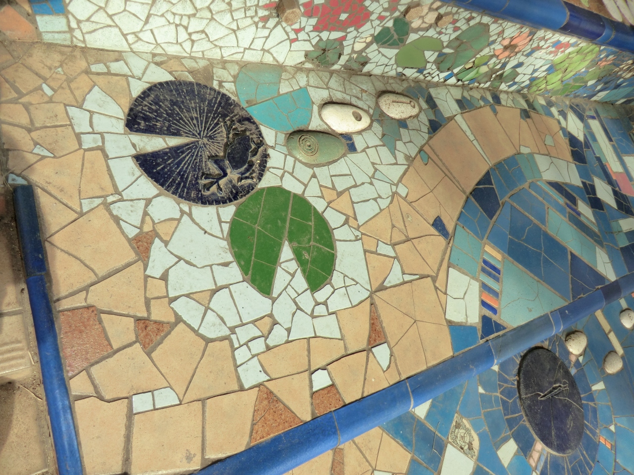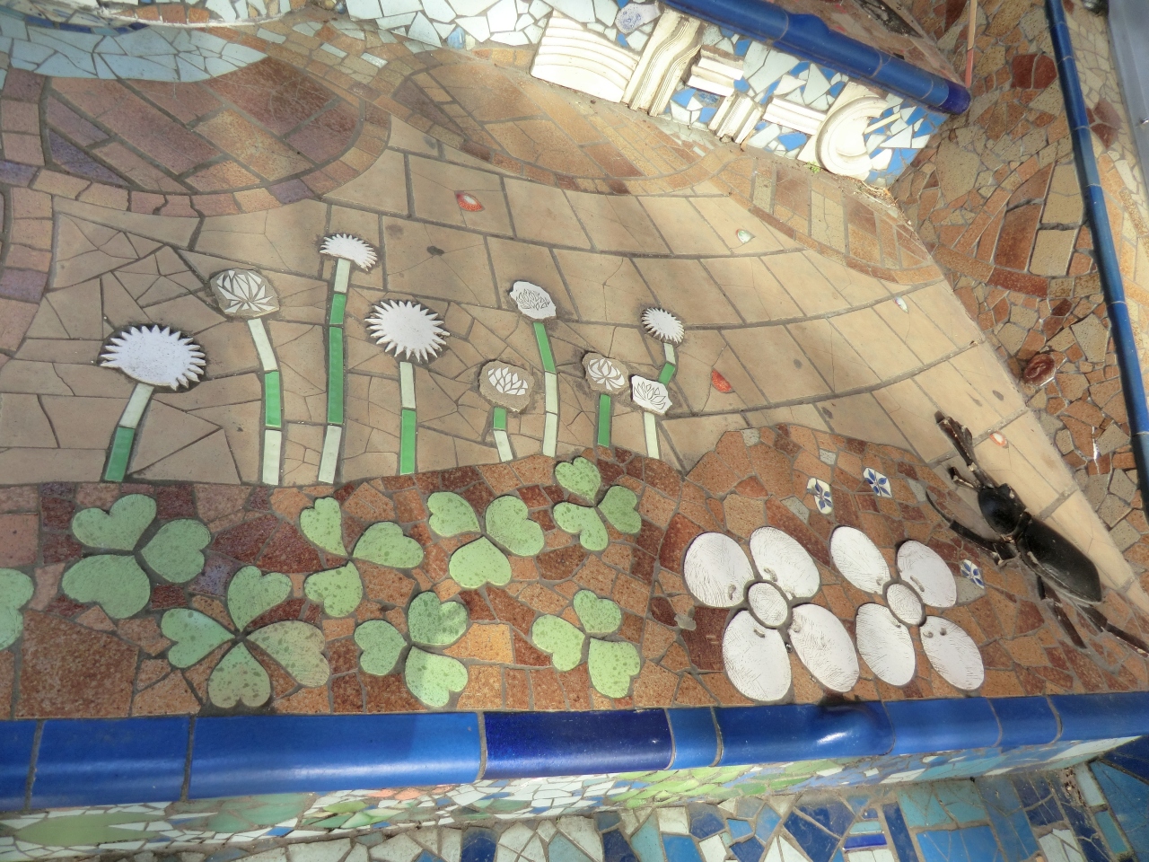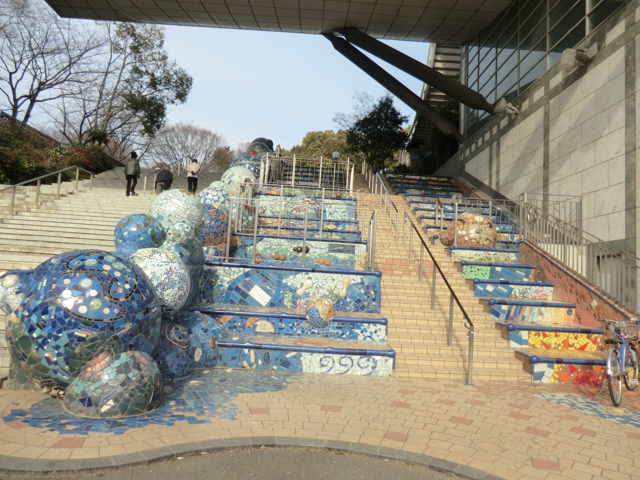 生き生き地球館そのものは平成26年3月を以て閉館になっていますが、その入口に続く階段は、まるでバルセロナのガウディ設計のグエル公園みたい。砕いた陶器を貼り合わせて、トカゲもいます!花博に行った折にはぜひ見てください!