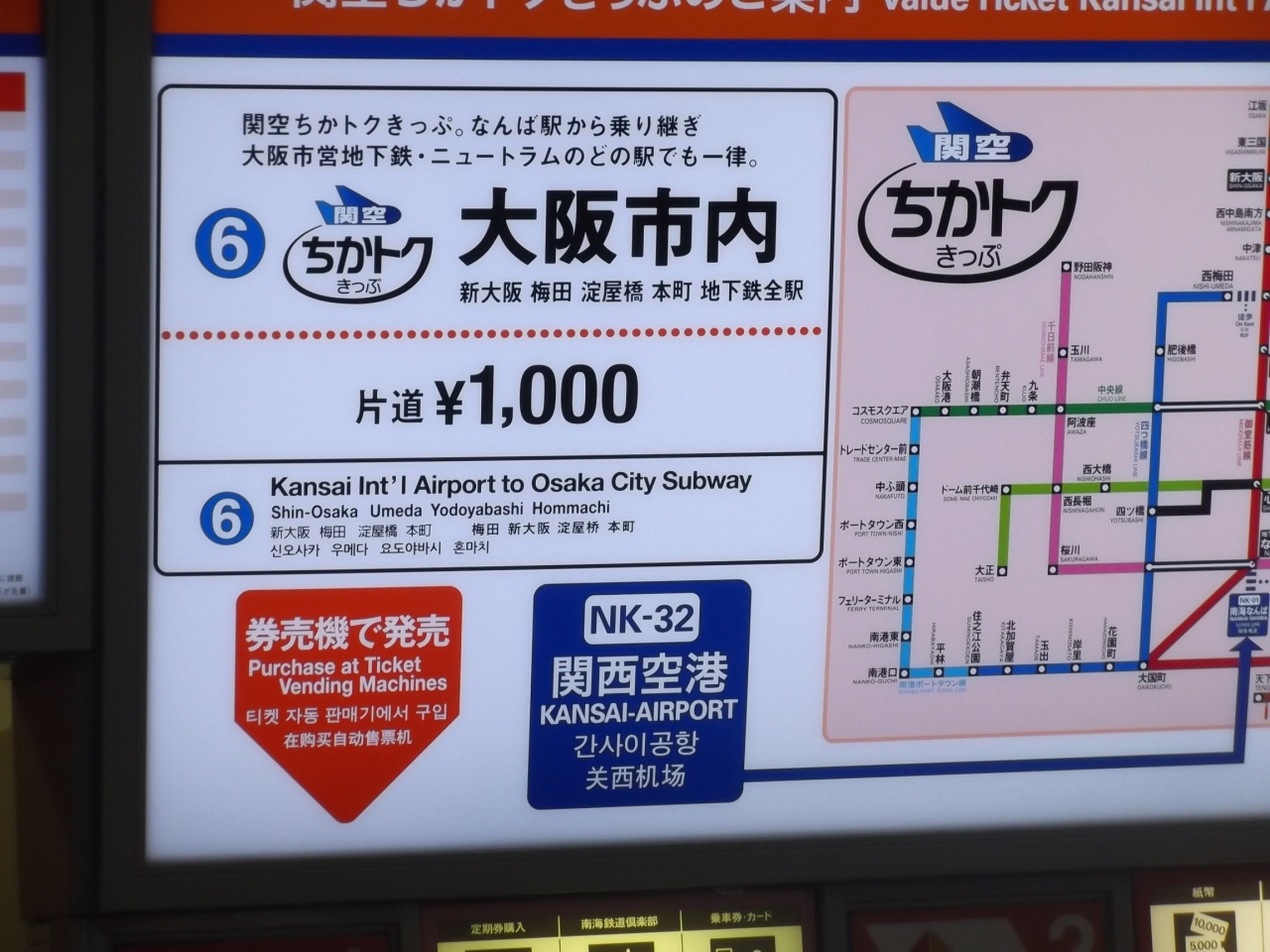 交通機関で関西空港駅~大阪駅で最も安く移動できるのは、ちかトク切符です。\1,000で南海電車のなんば駅経由で大阪市営地下鉄の各駅に行くことができます。この逆もあります。自販機で購入することができ、お勧めです。
