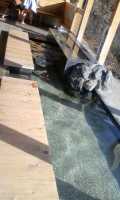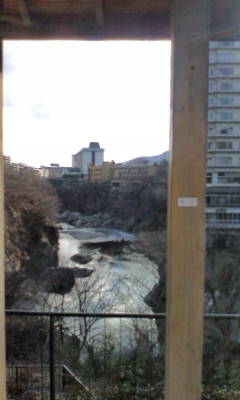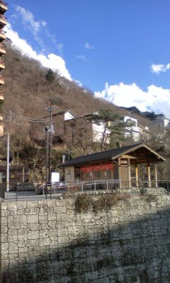 そのたもとにあるのが鬼怒子の湯です。愛らしい鬼怒子の像が目印です。細長い建物でかなりゆとりのある足湯です。きれいなお湯です。足湯に入ってのんびり、渓谷を眺めると絶景が広がります。