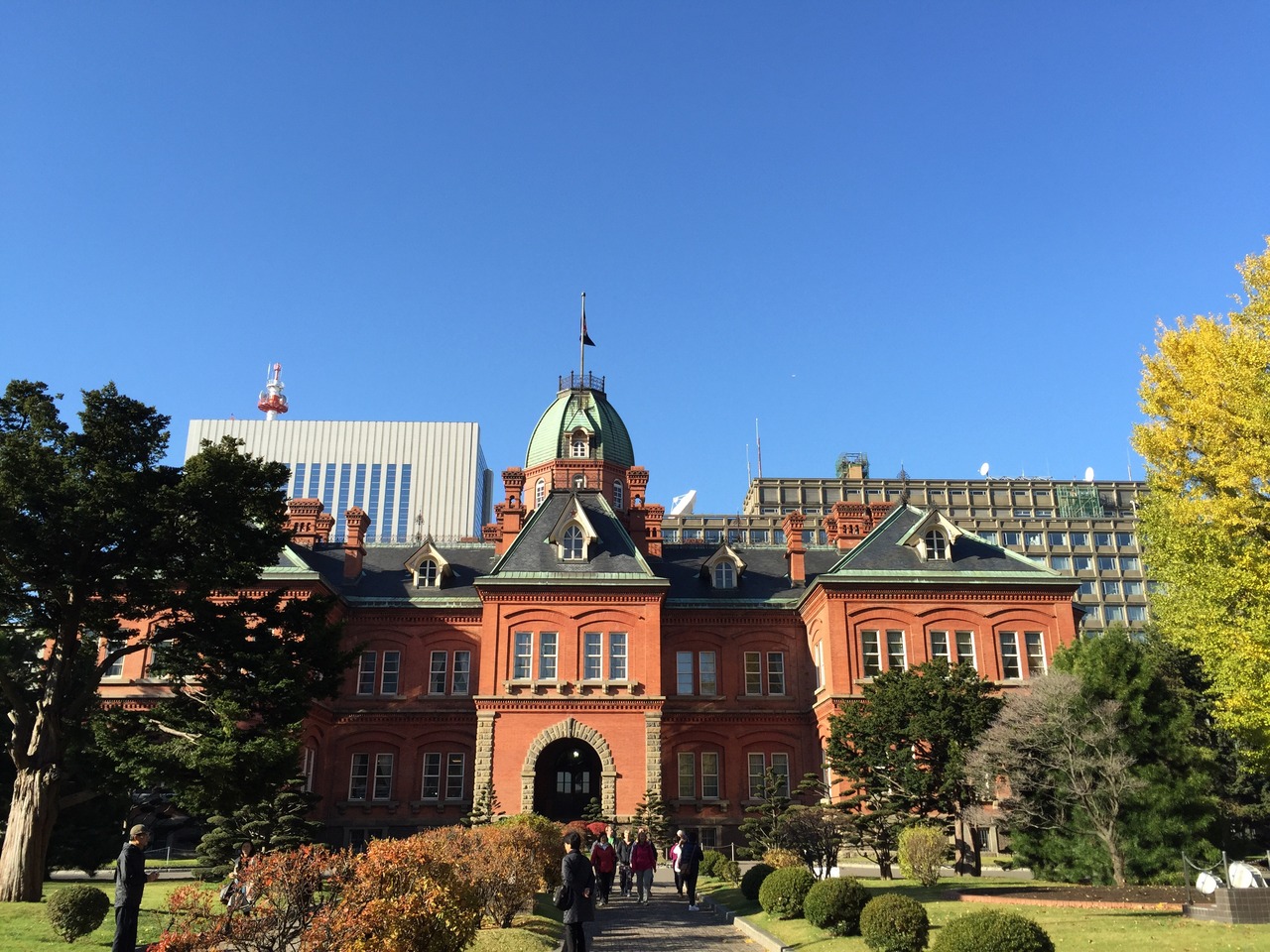 出張早起き観光その?。テレビ塔、時計台の次は赤レンガの旧道庁庁舎に。中には入ったことがあるので今回は外観のみ。この辺はイチョウの色付きが遅いようで、11月第2週でも楽しめました。青空、赤レンガ、イチョウ…最強です