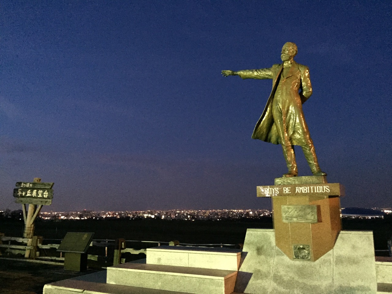 出張の後、最終のバスで乗り込みました。滞在時間は限られていましたが、寒いので30分いれば十分楽しめます。夕焼けには間に合いませんでしたが、日没直後の紺色の空にクラーク像が幻想的に浮かび上がります。羊が沢山います。入口手前のジンギスカン専門店がシュール