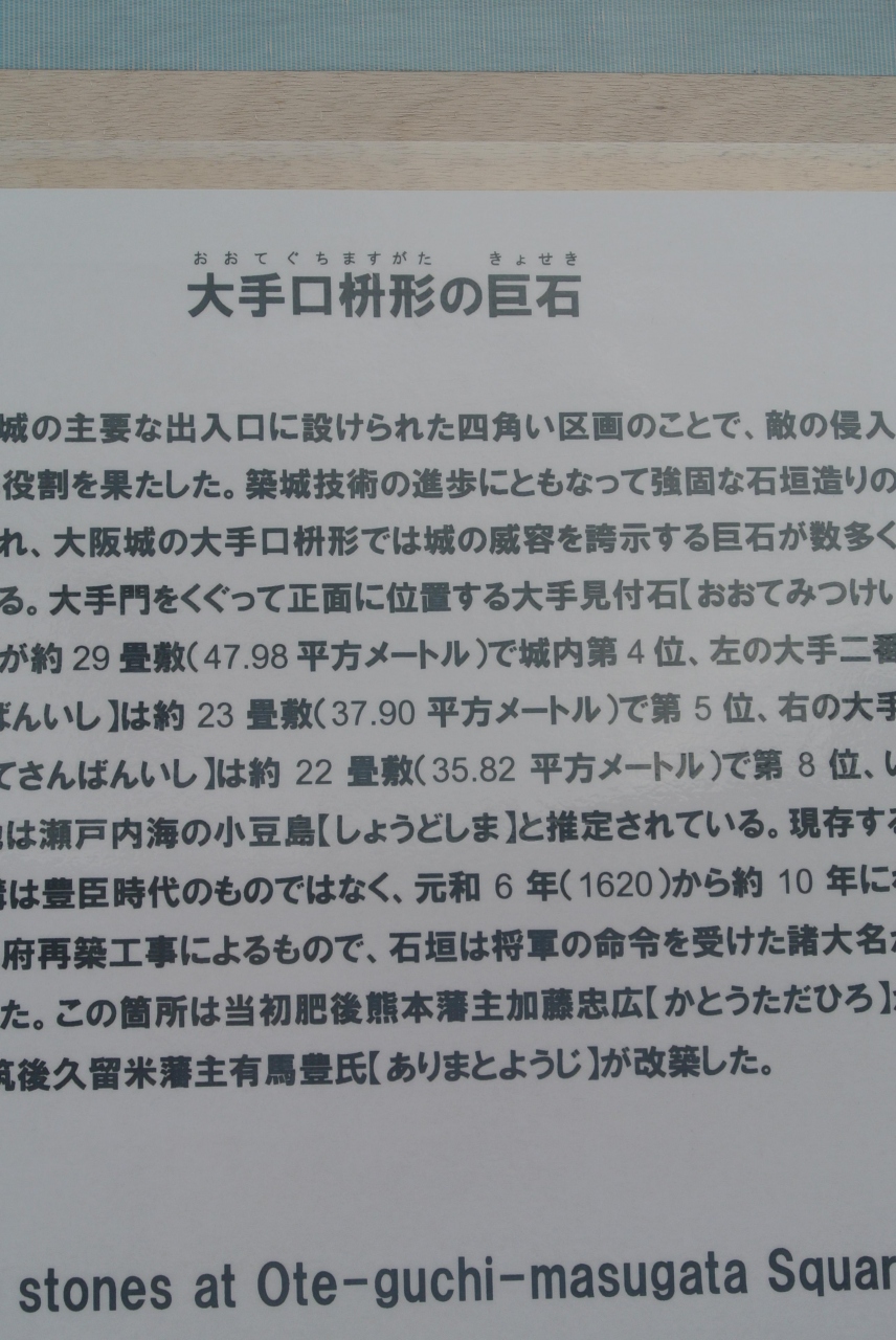 大阪城の大手門を入ったところで、まず大きな石を置いて人の目をひきつけます。天守閣への道には訪れる人の目を引き付け、驚かす仕掛けがしてあります。残念ながら現在修復中のため全部をみることはできませんでした。