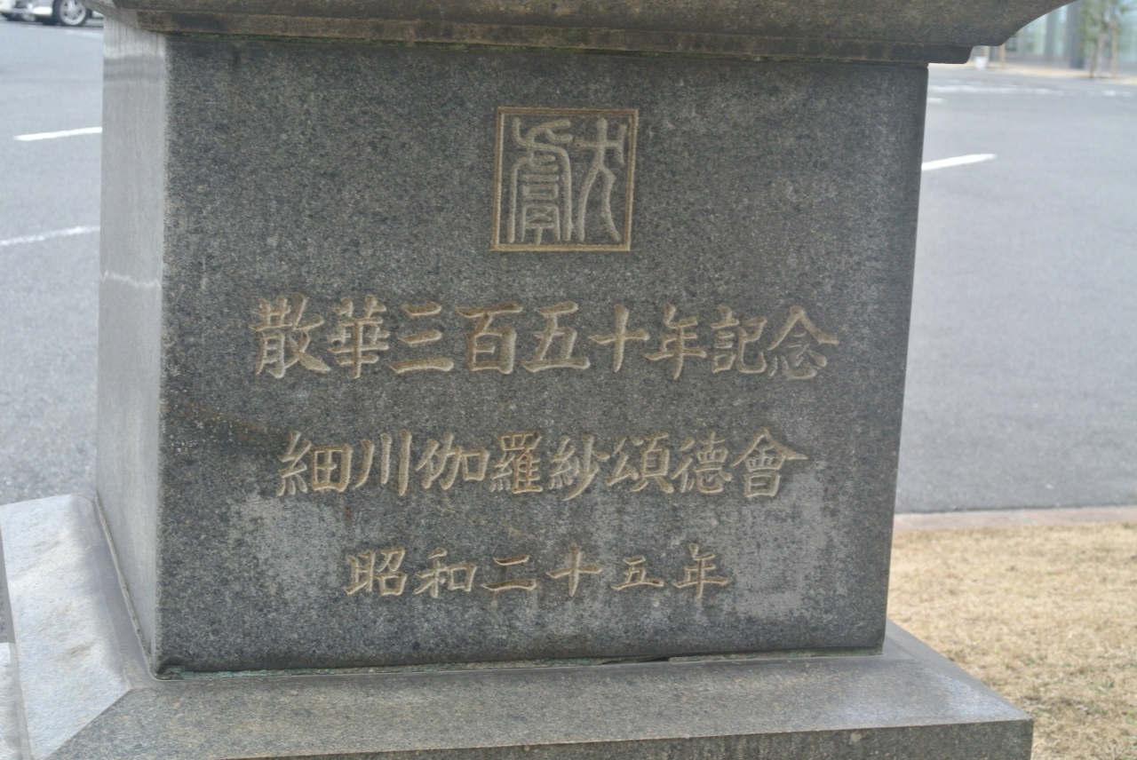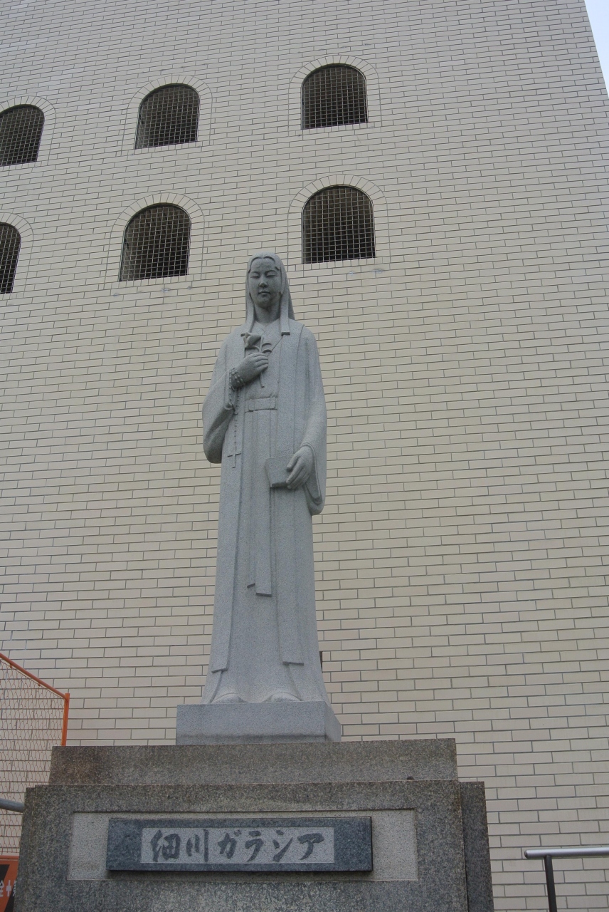 今はカトリック玉造教会の敷地になっていますが、その屋敷で自害した細川ガラシヤがカトリック教徒だったため、聖堂前にあるガラシヤ夫人像や、散華350年記念の碑など、この教会にはいたるところにガラシヤ夫人を顕彰するものが見受けられます。