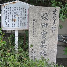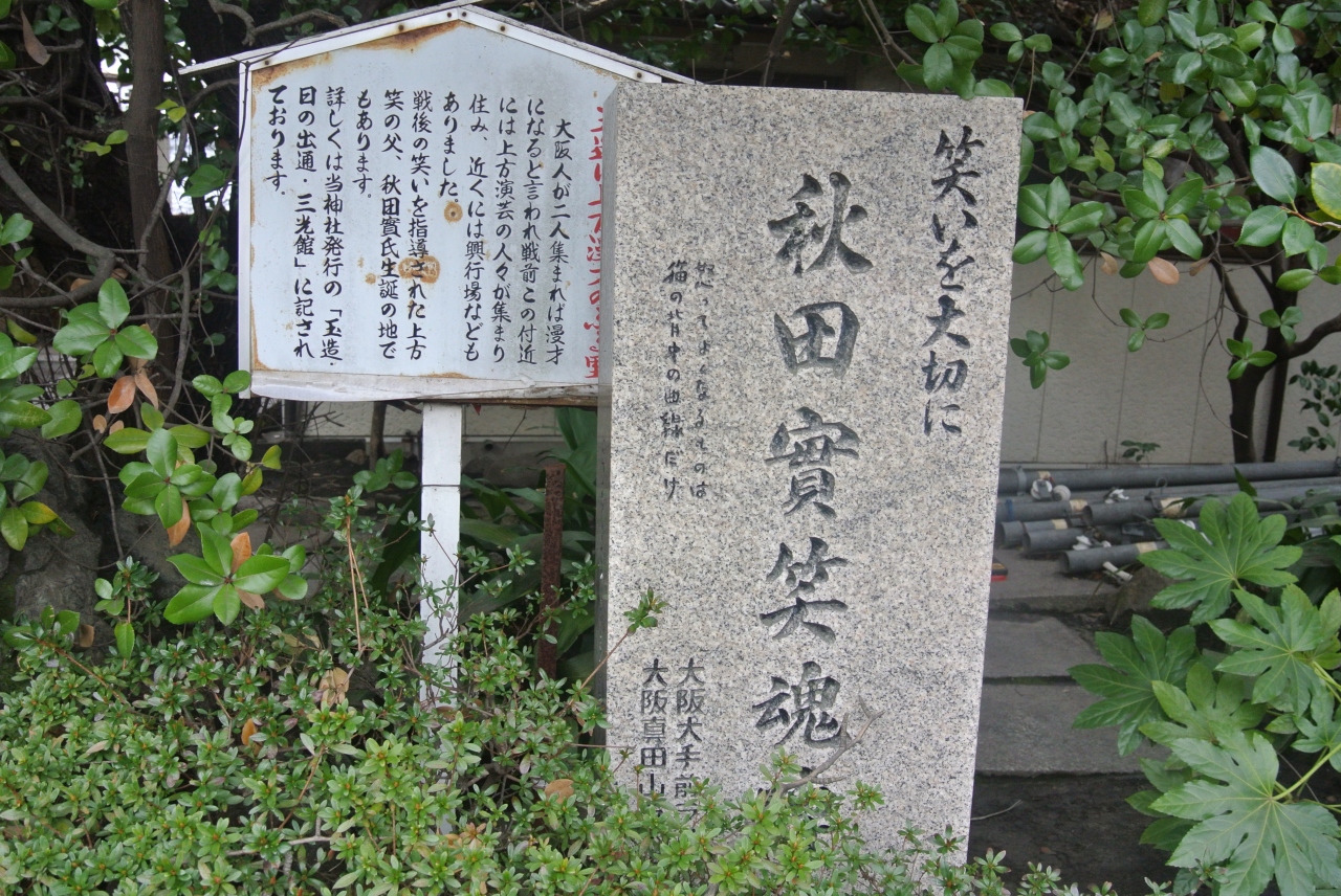玉造稲荷神社の境内にあります。秋田実は吉本興業の漫才作家で、古くはエンタツアチャコの台本を手掛け、大阪漫才界の重鎮でした。その秋田実の生誕の地であり、多くの芸人が住み演芸場もあったという縁でこの碑が建てられたようです。