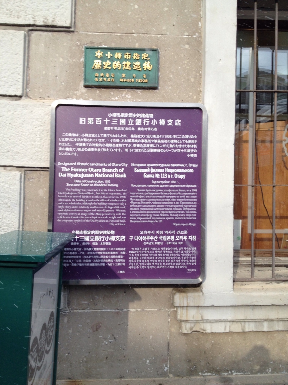 堺町通りをさらに進むと、オルゴール海鳴楼の看板。オルゴールは小樽で有名だよねと友人と話をしていたらこの建物にも紫看板。1893年建築の銀行系歴史建造物でした。銀行にしては背の低い建造物だと思っていたら、補足として小樽の発展と共に手狭になり15年程度で北の地区へ移転していました。小樽ってあれだけ名だたる銀行が立派な支店を開設し各行が競合しててもなおかつ吸収してしまうだけの財が集積していたのがよくわかります。市サイトの説明ですと木材商の事務所や製茶会社として歴史を重ね現在はオルゴール販売店海鳴楼として今も現役として活躍してるそうです。