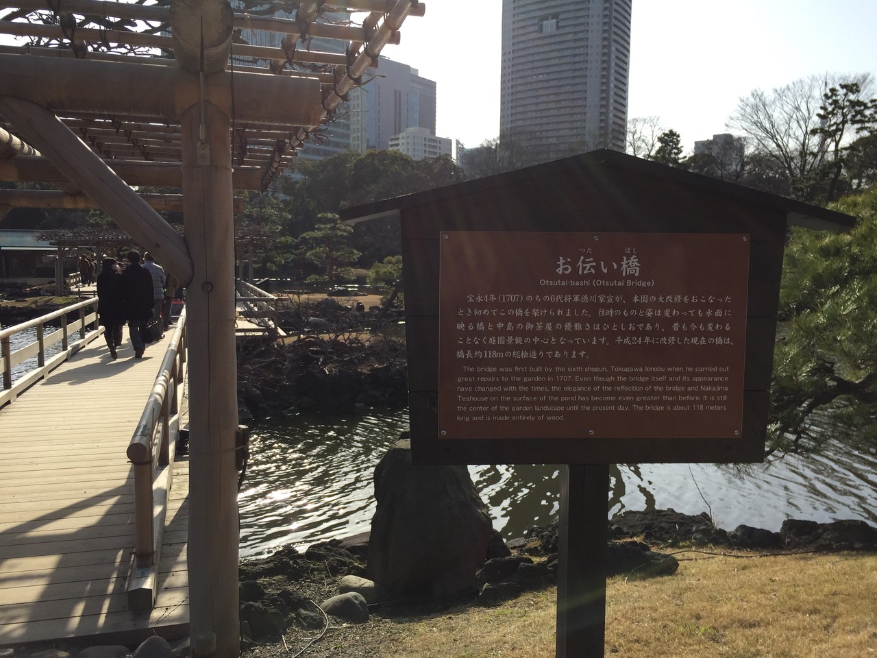 浜離宮恩賜庭園内にあります。潮入の池の岸と池の真ん中にあるお茶屋を結ぶ橋で、池の岸から眺めると、素晴らしい景観です。大都会東京のなかにあるオアシスのような場所です。先日、イギリスのウイリアムズ王子もこの公園に寄られました。