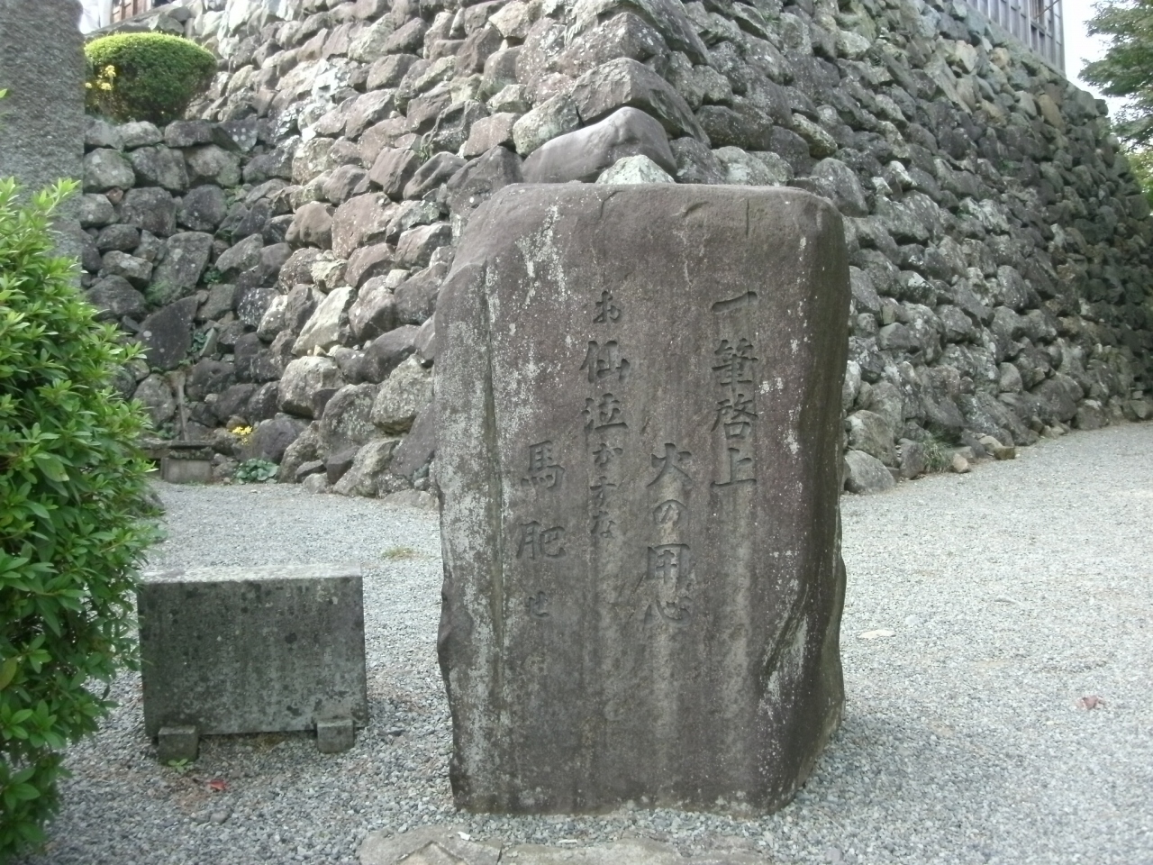 大きな石碑には、『一筆啓上 火の用心 お仙泣かすな 馬肥やせ』と彫られています。これは、徳川家康の家臣であった本多作左衛門重次が、戦場から妻に送った手紙文で、簡潔にして要を得たこの文は、手紙文の手本として今日でもよく紹介されています。