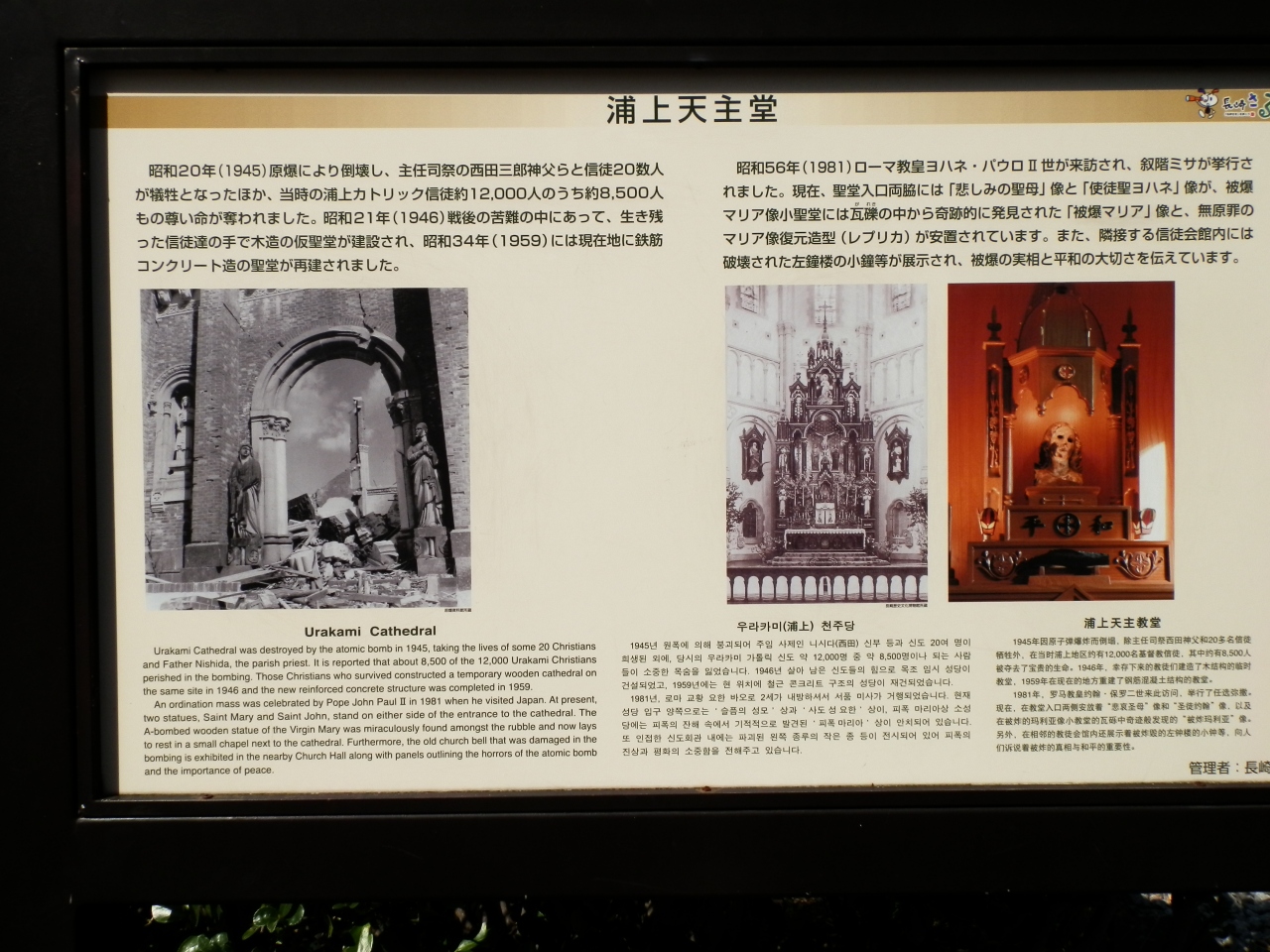 1945年(昭和20年)の長崎原爆によって破壊されたが、1959年(昭和34年)に再建された。1962年(昭和37年)以降、カトリック長崎大司教区の司教座聖堂となっており、所属信教徒は約7千人で、建物・信教数とも日本最大規模のカトリック教会だそうだ。