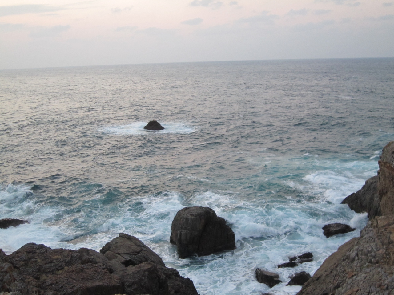 そのうえ、夕映えに染まりゆく荒々しい岩場、そして砕ける日本海の白波、昼過ぎの岩国から強行軍でやって来ただけの甲斐はありました。