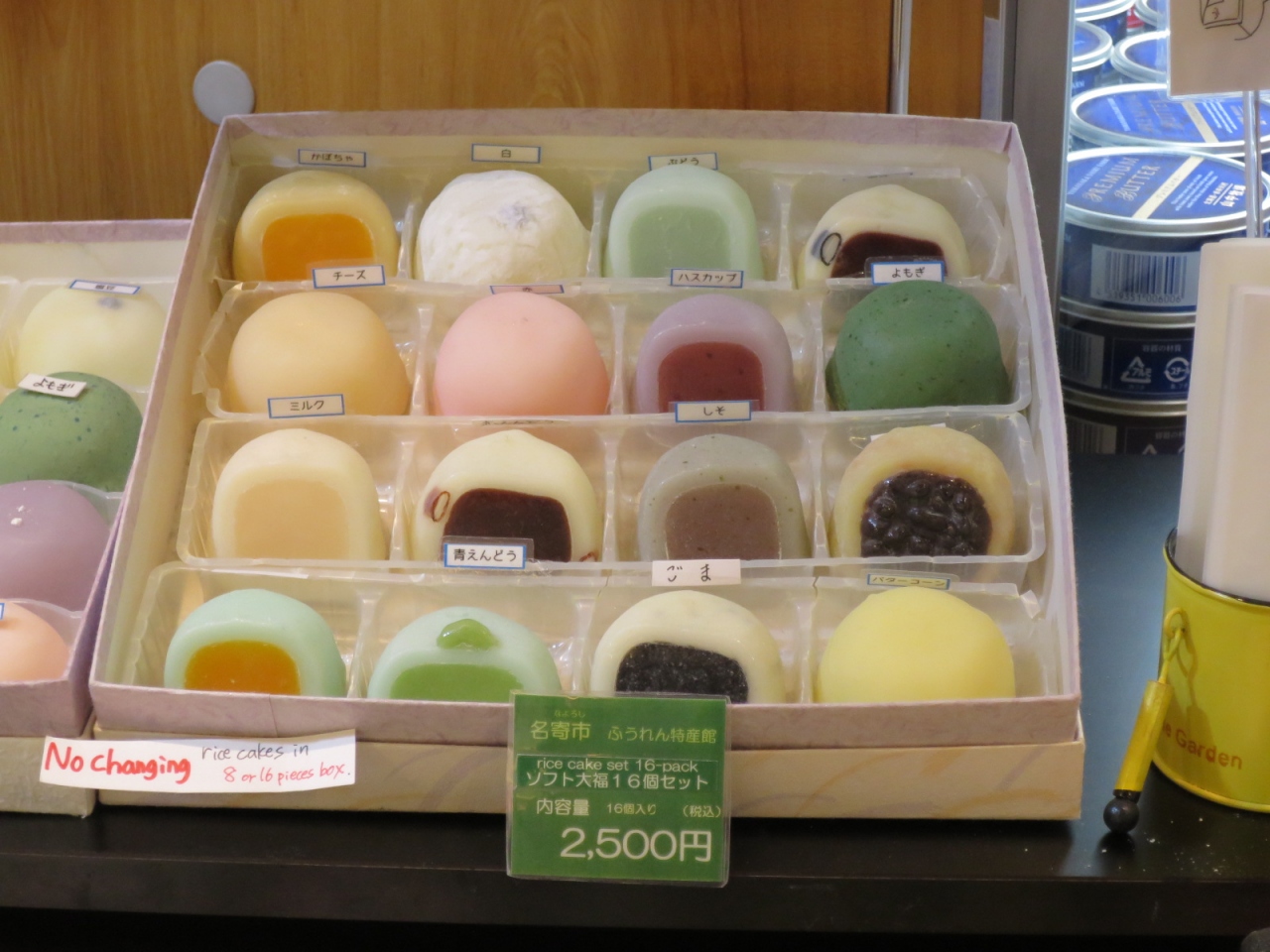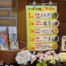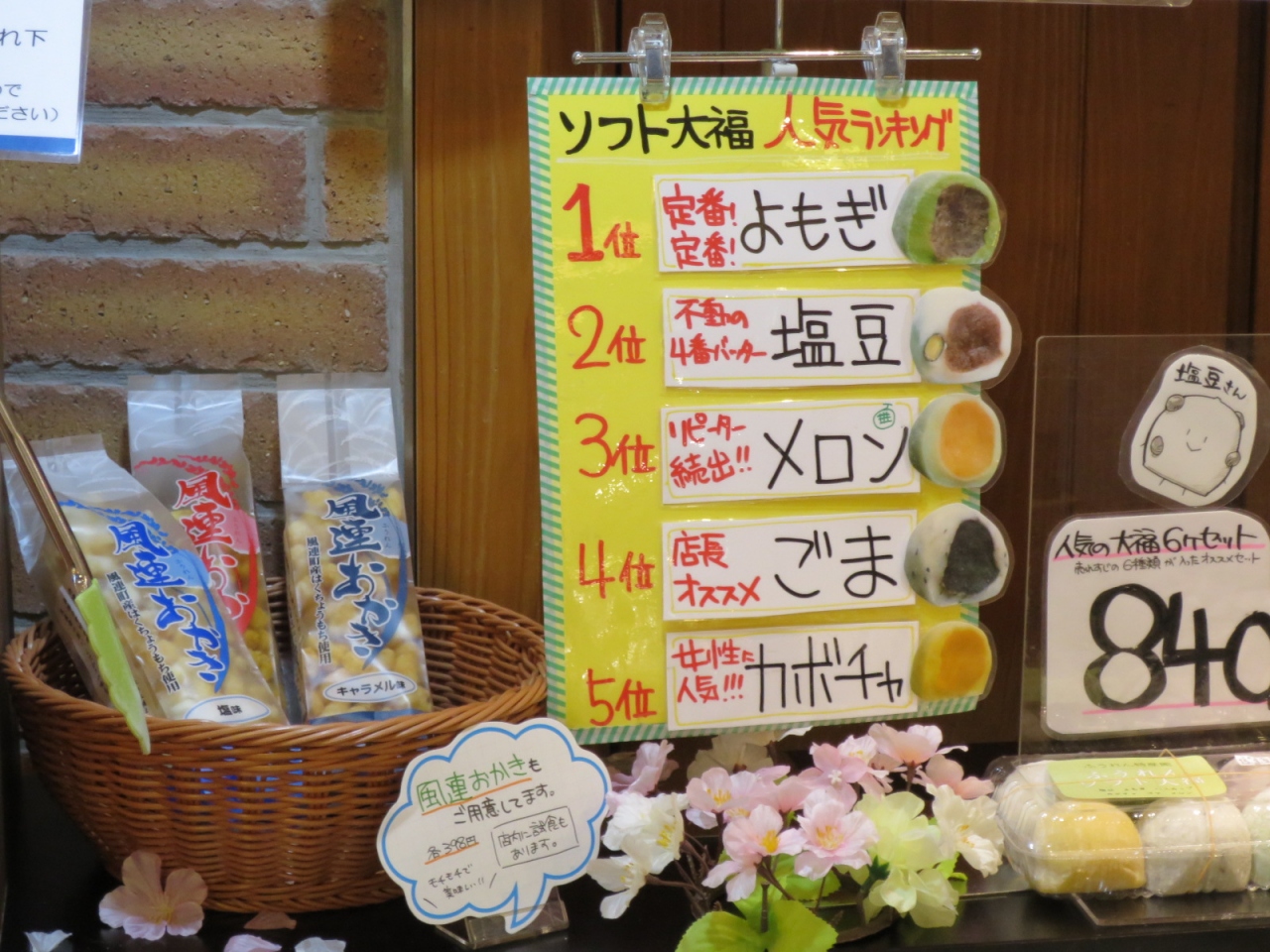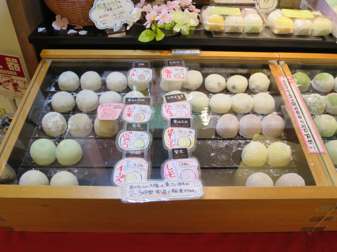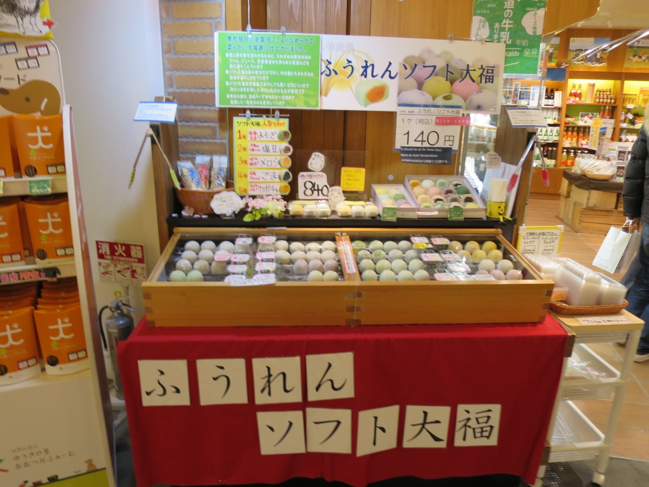 風連の名物、ソフト大福を売っていました。風連の道の駅では18種類販売していましたが、ここでもバラでは15種類を販売していました(訪問時)。人気ランキングで1位はよもぎ、2位は塩豆、3位はメロン…と続くそうです。メロンやマスカットなどはお菓子のような味わいで美味しいです。フルーツ系のものは美味しいですが、ハスカップは微妙な味でした。