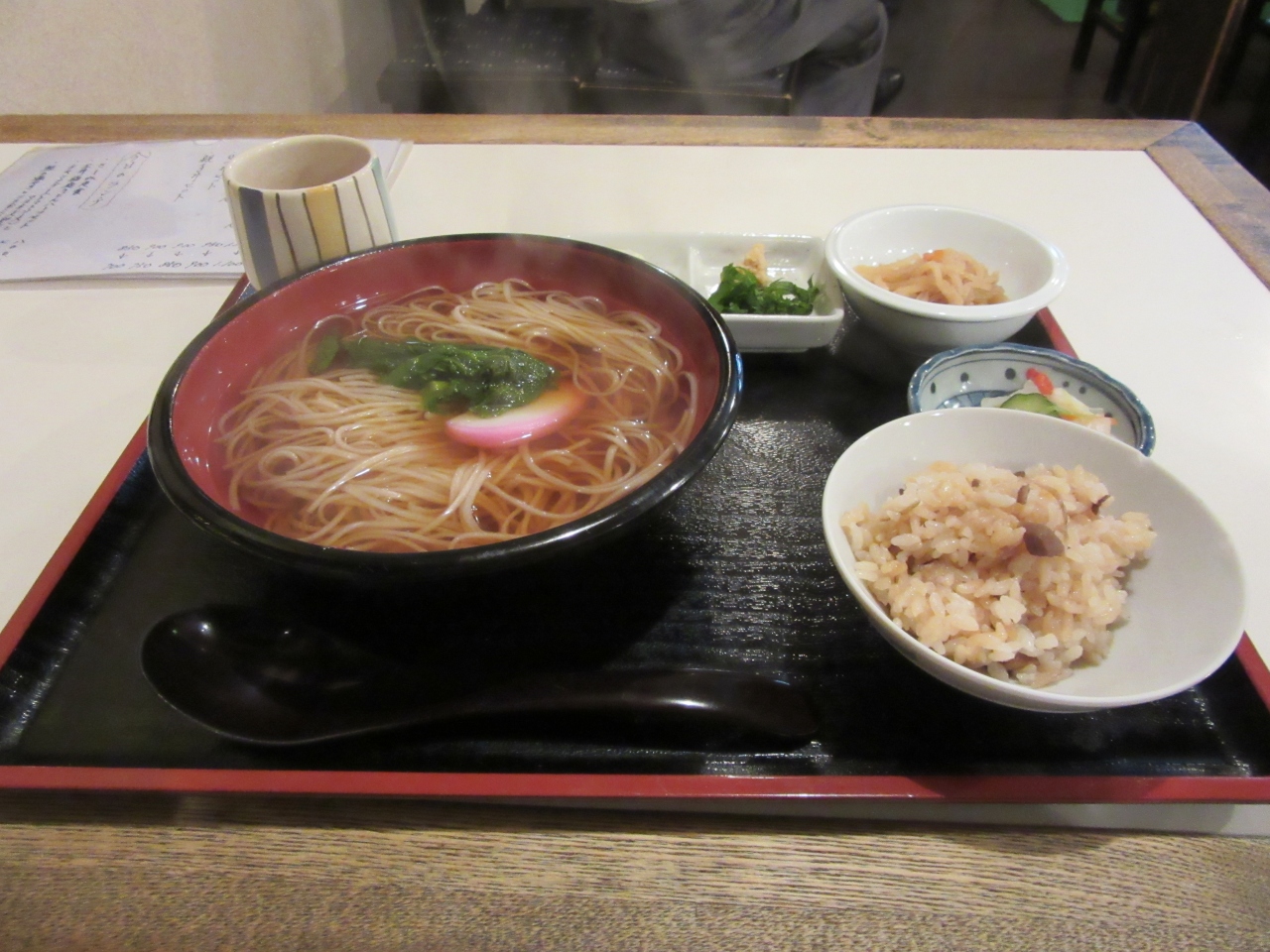 早々入りました。1時近かったのですが、お客さんは疎ら。落ち着いた店内で温かい稲庭うどんをいただきました。のど越しよいコシで汁は関東味らしさ。薬味の生姜入れはお好みで・・ご賞味あれ。