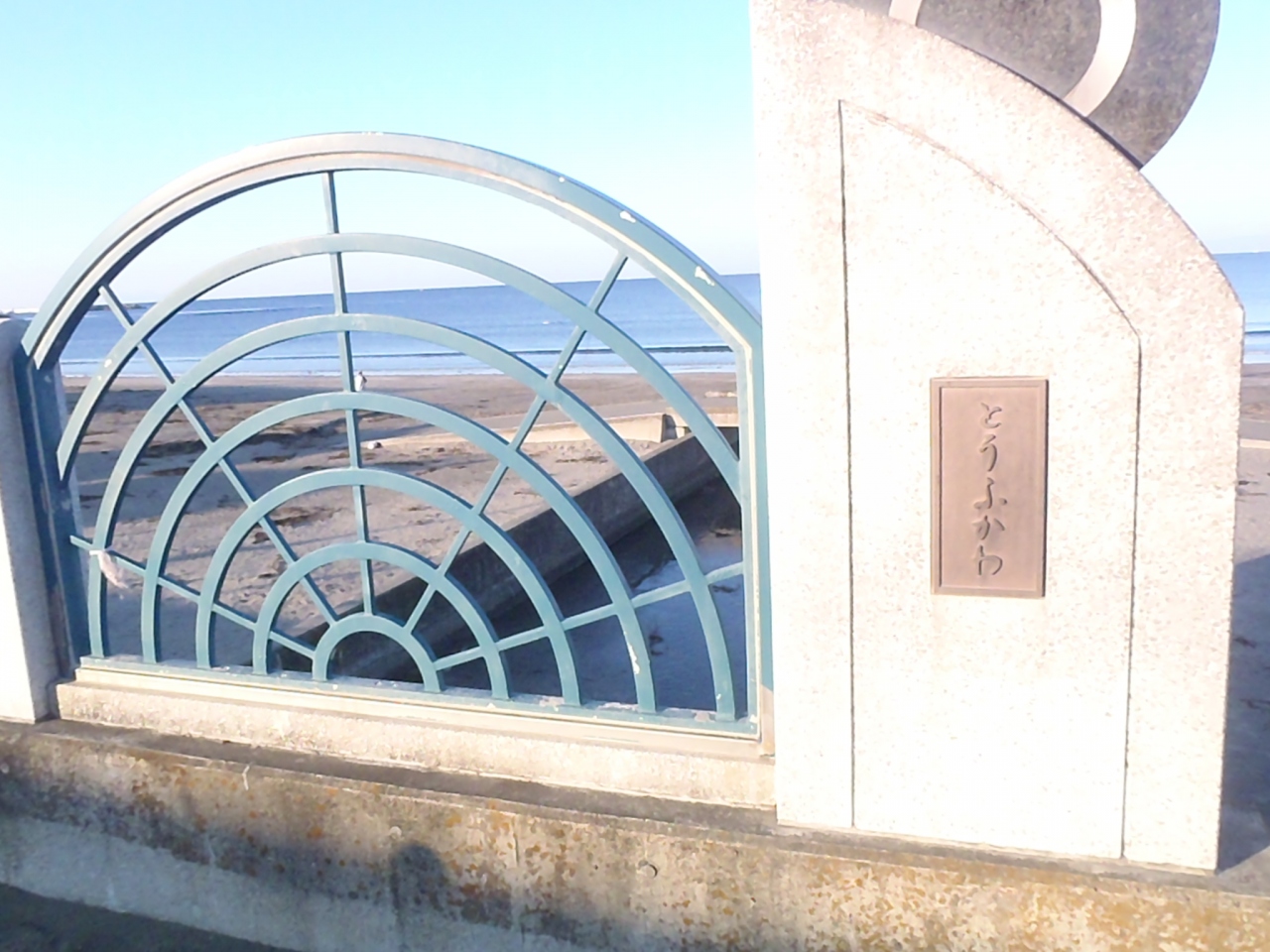 鎌倉駅東口から若宮大路を南下、一の鳥居を超えて真っ直ぐ滑川交差点を左折、滑川に架かる橋の向こうが材木座海岸です。
