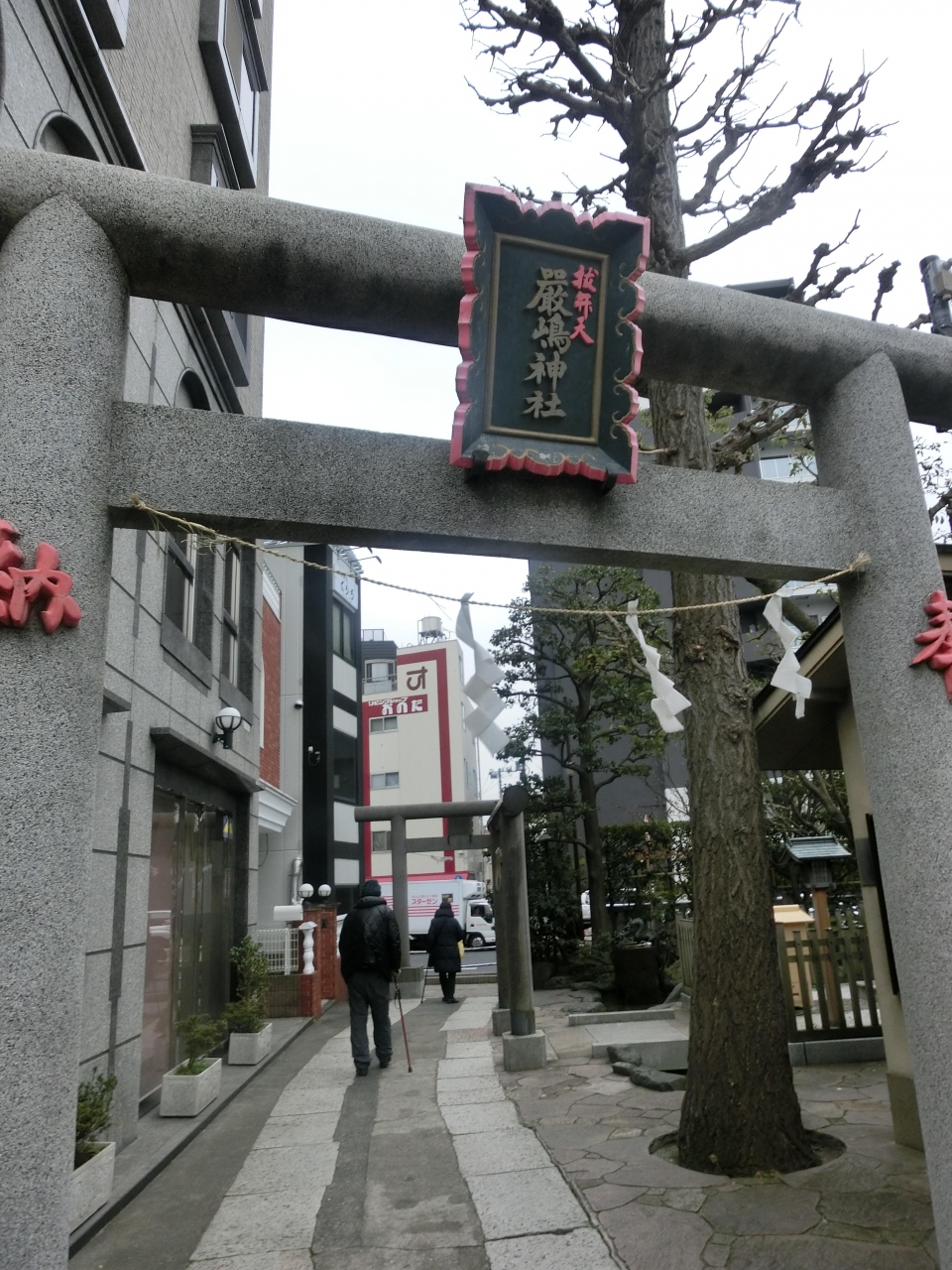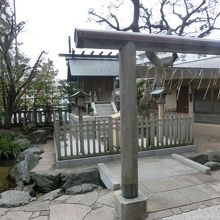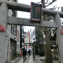三角形状の交差点のてっぺんにあり、小さな神社だ。