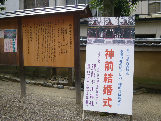 JR奈良駅と近鉄奈良駅とのほぼ中間にあります。この神社は「内助の功」を得たい方にお薦めのようです。境内にカエルに似ている石があります、カエルは多くの卵を産み繁殖力あり幸せになるとされています。また、奈良市最古の神社とのことで、結婚式ができるようです。「率川神社の清々しい神前で結婚式を」との看板が目につきました。良いですね、神社での結婚式も。。。