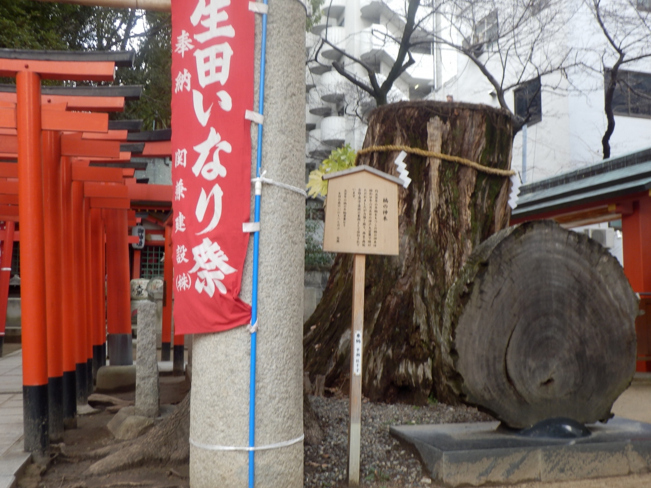 生田神社の境内、本殿の右奥ある楠木について、横の説明板には次の様に記されていた、、元は500年の年輪をもつ神木であったが昭和を21年6月の神戸大空襲で焼けただれたが今日力強く蘇り再生して、合格、復興、の象徴として信仰されている、蘇った楠木の横に焼けた楠木の輪切りが展示されている
