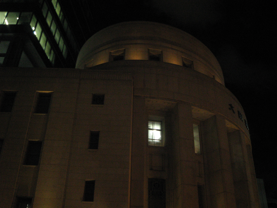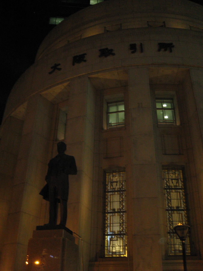 元は大阪証券取引所でしたが、現在は「大阪取引所」と名前が変わっています。どっしりとした重厚なつくりで、円柱のような形状が印象的です。正面には、見上げるほど大きな五代友厚の像があります。