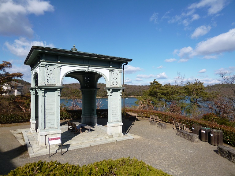 明治41年に東京に建てられた「宗教大学」の車寄せであったとのことですが、説明を読まないと休息所か東屋のように見えてしまいます。意図してこの場所に移設したかは定かではないですが、広大な敷地の明治村見学の途中、入鹿池を眺めながら休息するには丁度良い場所のように思います。