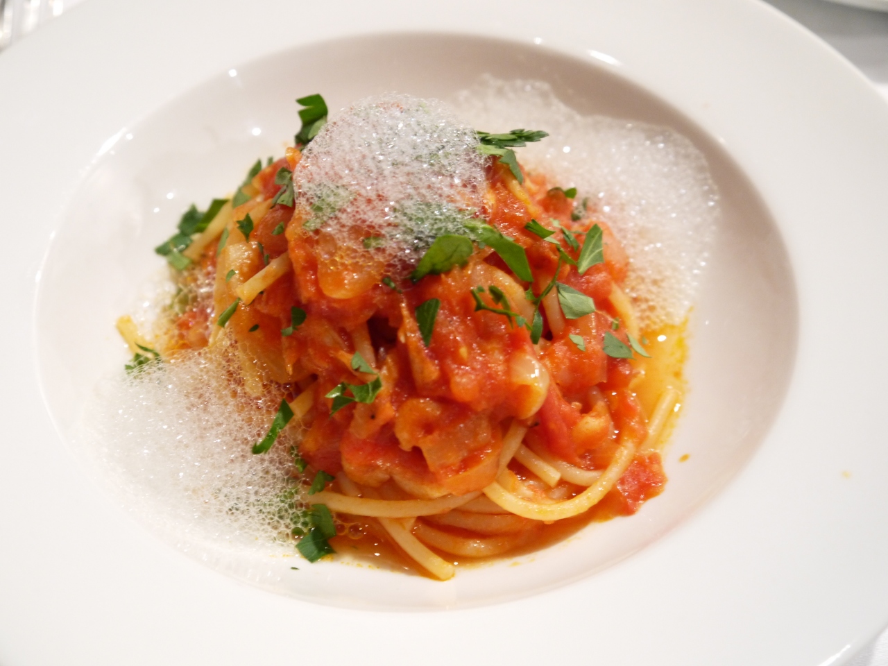 時間もなかったので、コースではなくて、パスタと前菜の組み合わせ。この時期のお勧めという桜エビのパスタをいただきました。上にシャボン玉のような泡がのっかっていて、聞くとレモン風味のトッピング。ちょっと遊び心もあるお店です。