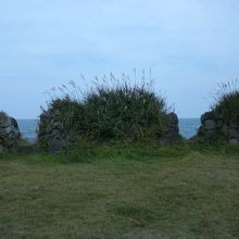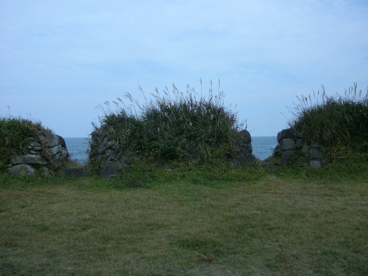 海に向かって石垣で組んだ数基の砲眼が残っています。周辺は草に覆われていて、説明板も傷んでいるなど、訪れる観光客を見かけることがない淋しいところでした。