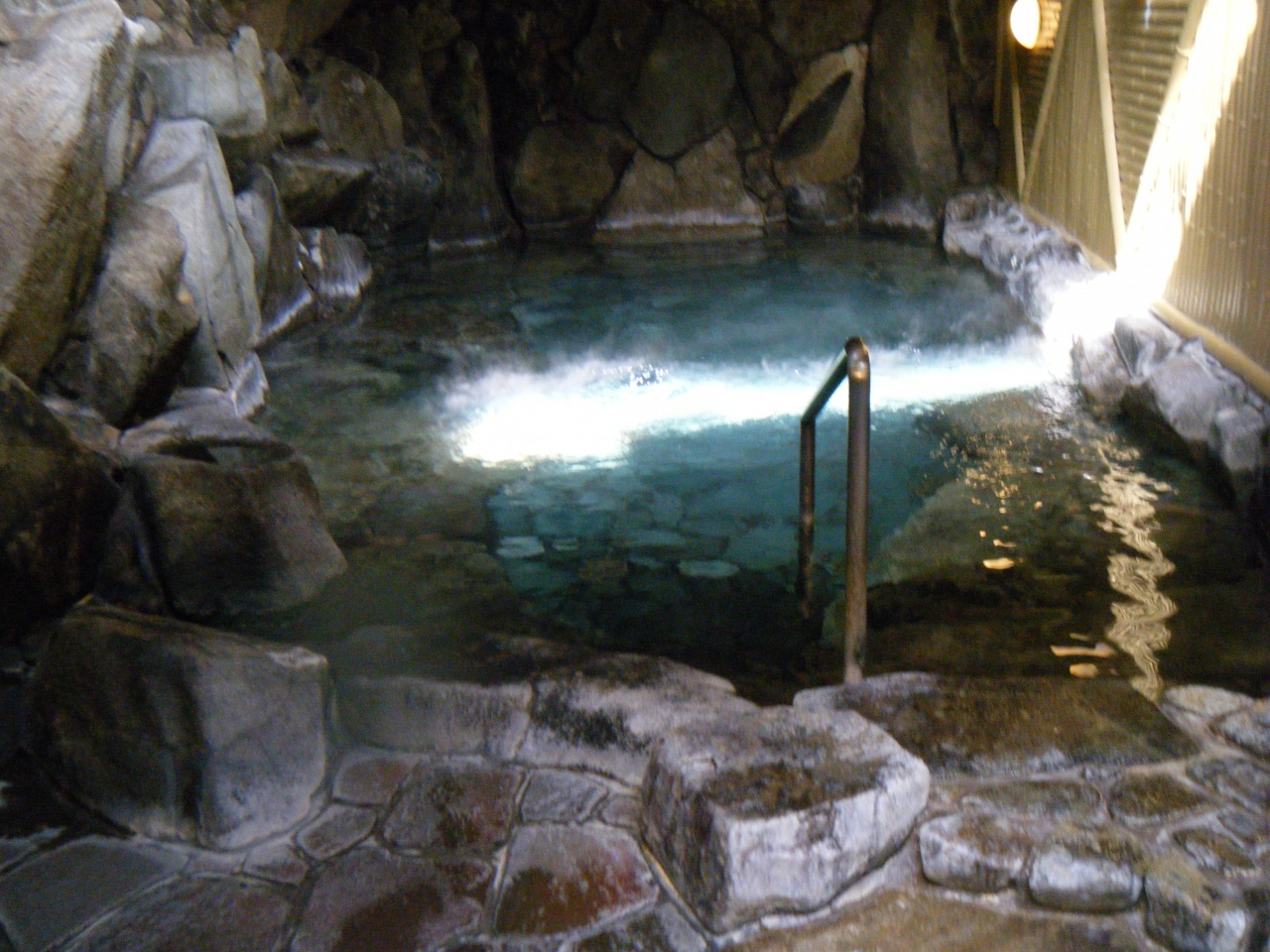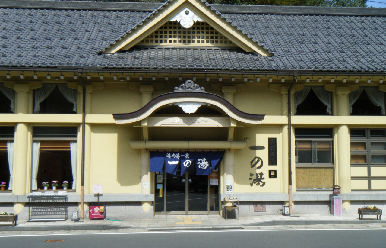 城崎の外湯の中で人気は「御所の湯」に譲っていても、城崎温泉を象徴するのが「一の湯」では。桃山様式の建物は趣きがある。裏山を削って作った半露天の洞窟風呂は天井が高く、圧迫感はない。奥行き8m位の広さで15人はゆうに入れる。