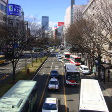 仙台駅前から仙台城方面へ延びる並木道で、定禅寺通り、広瀬通りと並ぶ仙台のメインストリートです。12月には並木にイルミネーションが施され、初夏にはケヤキが青々と茂ります。また仙台市内はまだ地下鉄が整備されていないので、バスの数が非常に多いです。歩道橋から通りを眺めると、ほとんどバスでした。