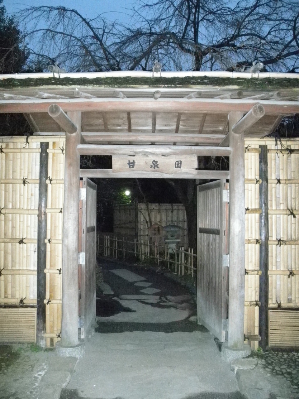 もう日が暮れて暗くなっていましたがが午後7時まで開いているというのを見て入園しました。園内の木は、雪が付着して樹木の枝が折れないように縄で枝を保持する雪吊が行われていて、金沢の兼六園の雪吊りの様でした。暗かったですが他に誰もいない公園を独り占めしました。
