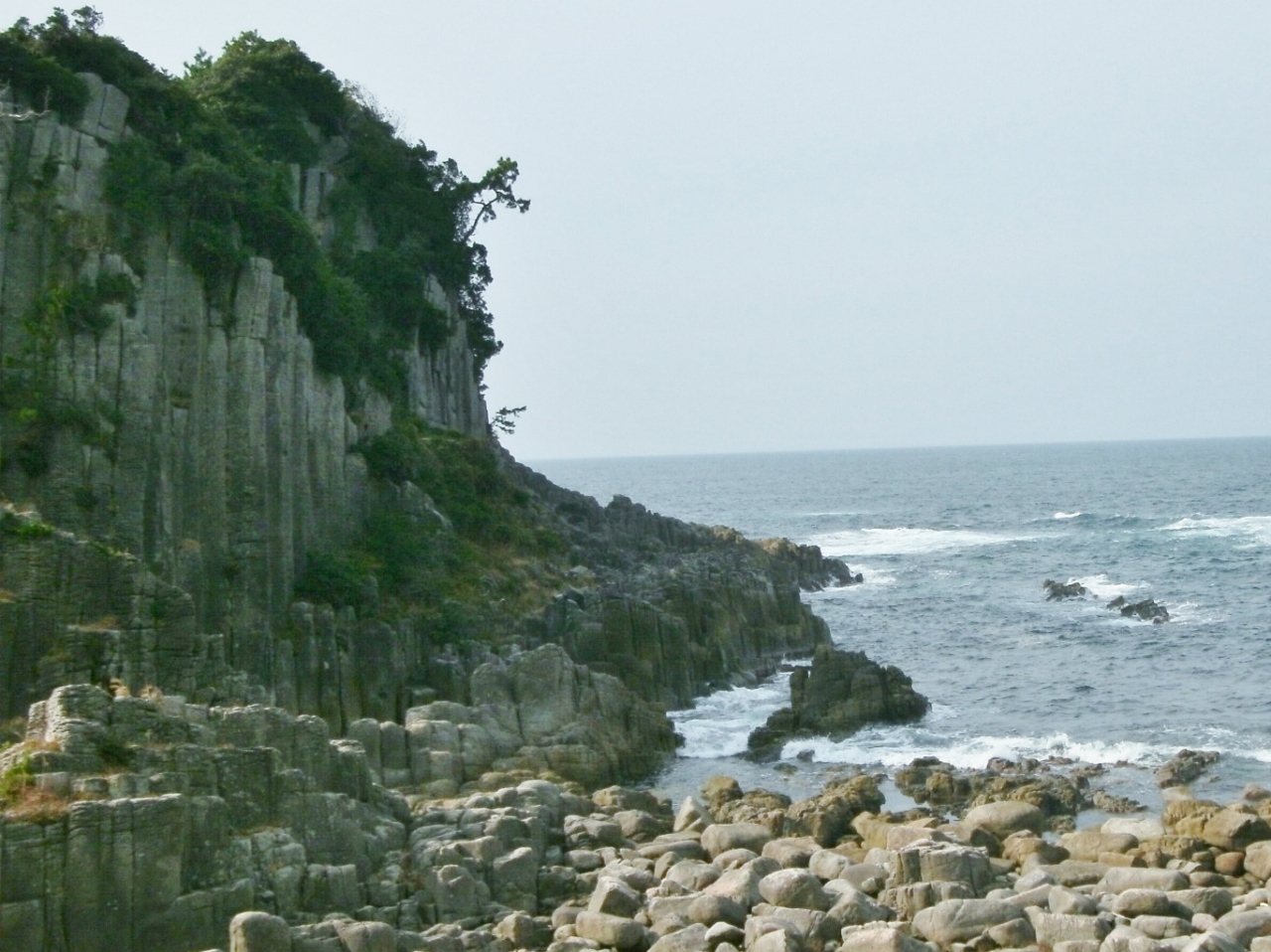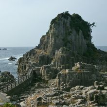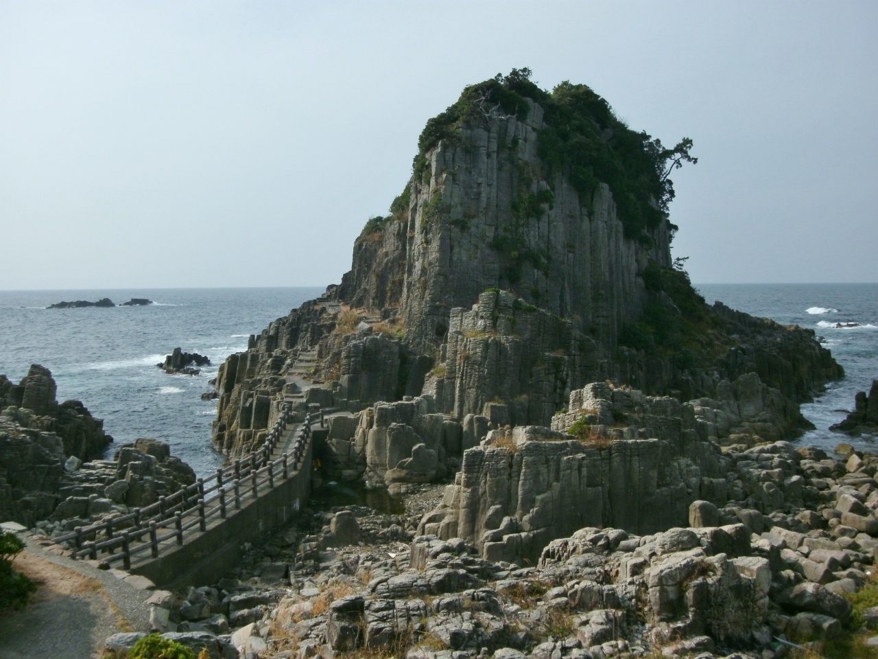 柱状の岩が鉾を並べたように見えるので鉾島と呼ばれるようになったそうで、遊歩道も整備されていて、小さな橋を渡って高さ50mの島の上のほうにある地蔵のところまで登っていけます。鉾島の断崖から見下ろす迫力はなかなかのものです。