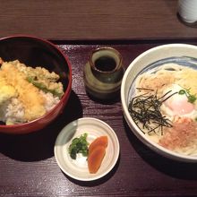 ランチで利用し、ぶっかけうどんとミニ天丼のセット960円を注文。ミニ天丼は、海老、かぼちゃ、ししとうのネタで、少しご飯がパサついていたのが減点。