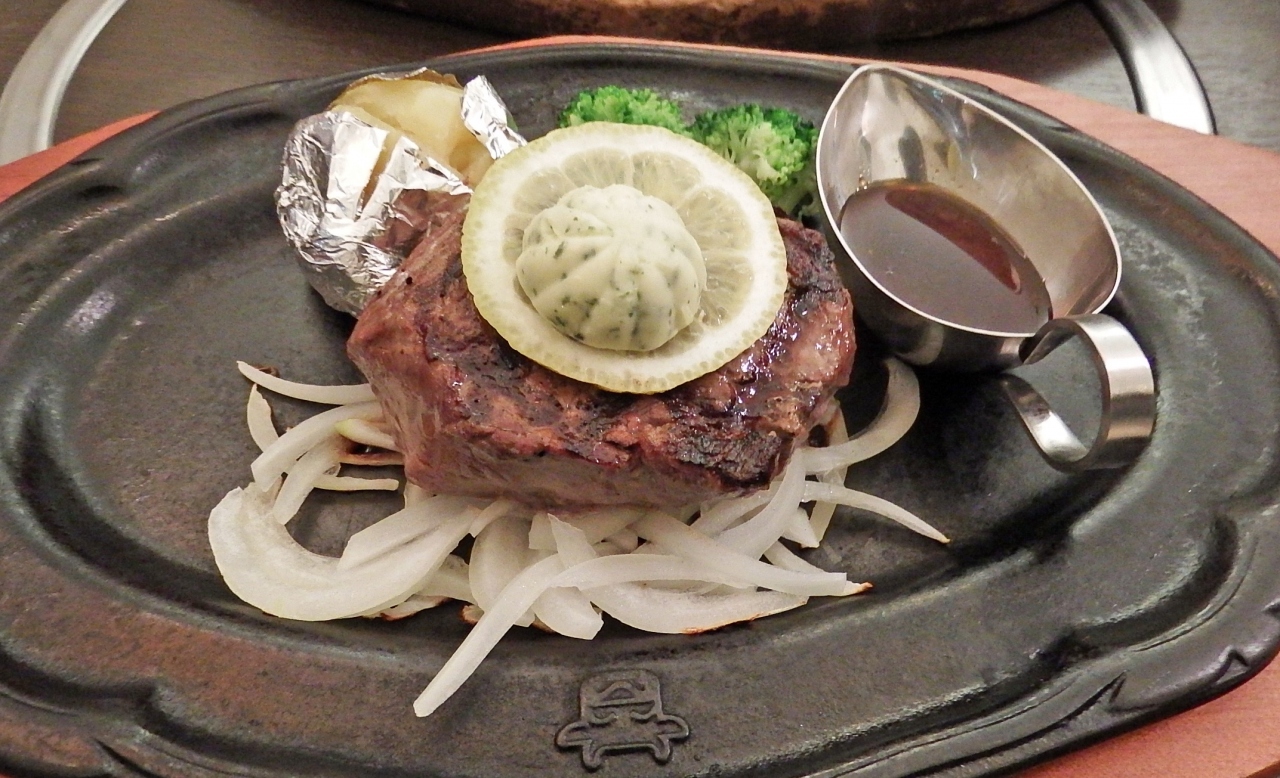 ヘルシーステーキとして提供されているランプステーキ150gをいただいた。ライスまたはパン、サラダまたはお新香、ポタージュまたはとん汁がついて、3380円。おいしさを考慮して、とってもリーズナブルな価格です。