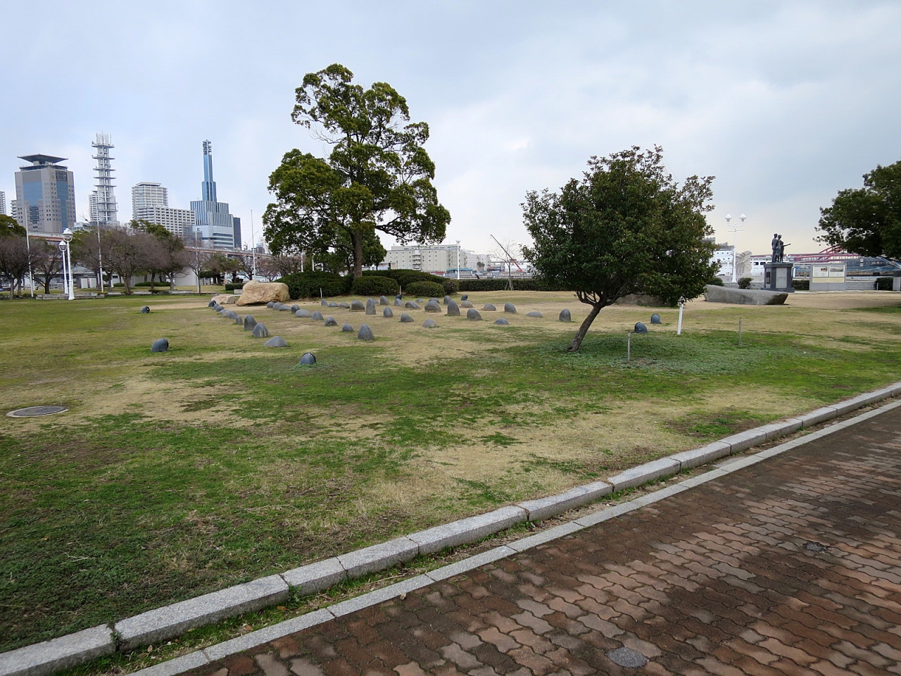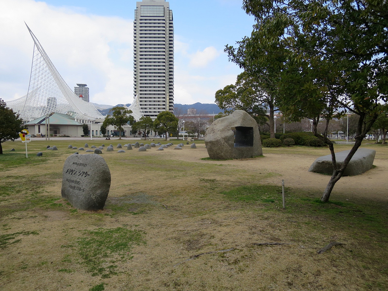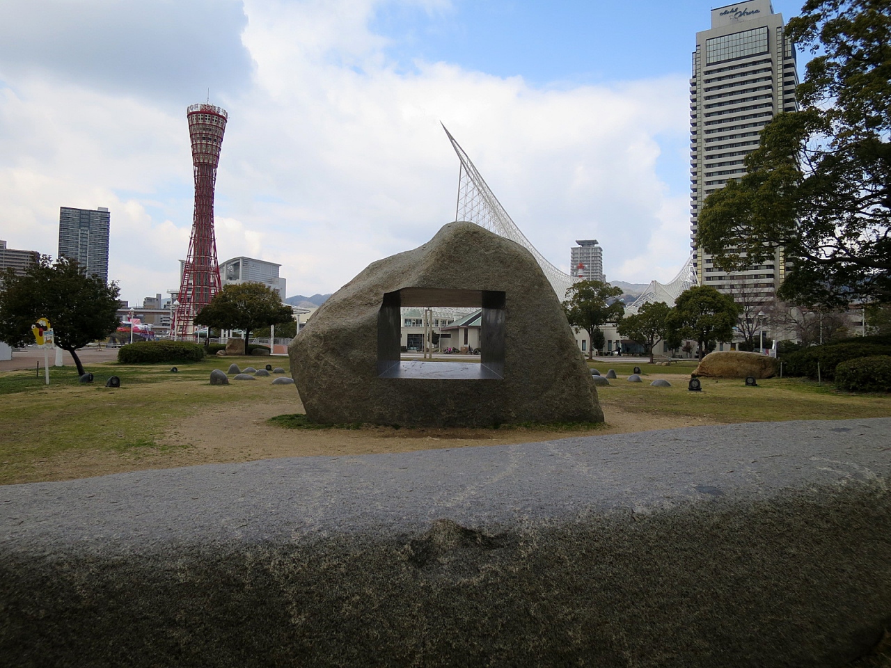 「メリケンパーク」内にある芝生の広場に「メリケンシアター 明治29年(1896年)外国映画上陸第一歩」と書かれた大きな石がありました。さすが神戸の歴史を感じられます。その奥には中央部分が四角い形に大きくくり抜かれた石がありましたから、それが映画のスクリーンをイメージしているであろうことも容易に推測できましたし、スクリーン正面辺りに置かれた横長の大きな石は、おそらく客席をイメージしているのではないでしょうか。スクリーンの裏側には映画スターの名が記された小さな石がたくさん置かれていました。石だけで映画館をイメージさせるデザインセンスはさすがですね。