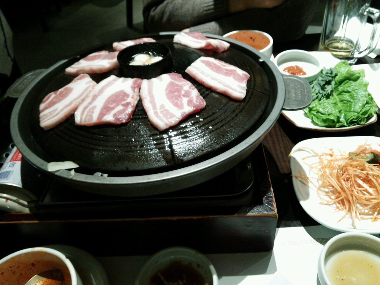 サムギョプサルは、お店の人が焼いてくれました。専用の丸みのあるプレートを使うので、脂がどんどん落ちていくのであっさりたべられます。