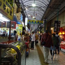 公設市場へ行く商店街。ここは国際通りとつながっています。商店街内にはサーターアンダギー店やおみやげや、レストラン、カフェなど観光客が喜ぶ沖縄が何でも揃っています。だから観光客がとても多い通りで活気づいています。