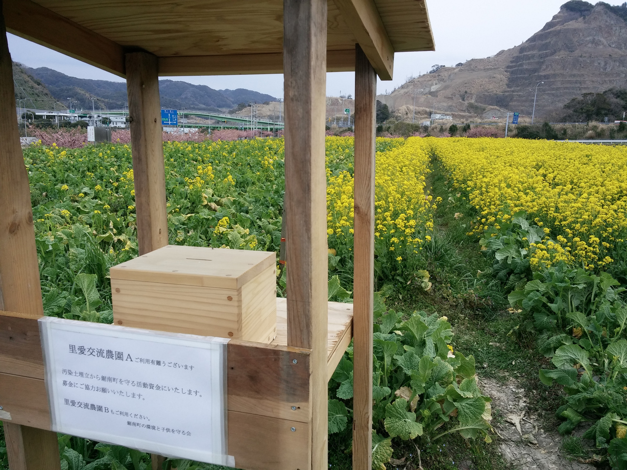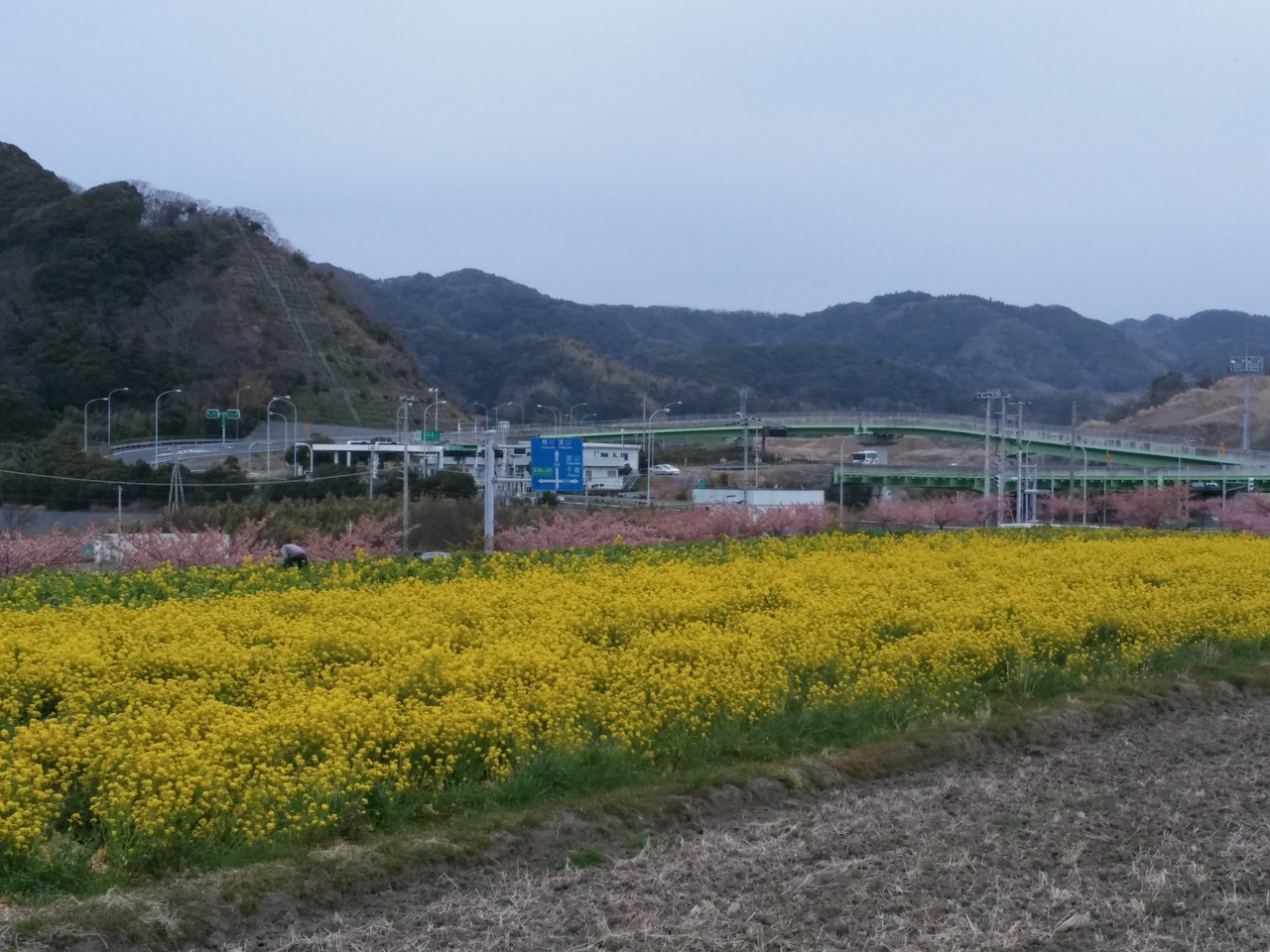 鋸南富山インターを降り右折すると保田へ到着しますが、保田までの街道沿いは穴場がたくさん。インター降りてすぐの右には愛里交流農園があり、今は菜の花の絨毯と満開の桜が見られます。菜の花は、子供と環境を守ろう!をスローガンに自由に摘みとって下さい。と立て札があります。環境保全のため協力金を寄付しました。さらに街道先には、無人の野菜販売があり格安新鮮な野菜を売っています。小さいので見落とさないように。街道沿いには季節の花がいつも咲いています。お散歩もお勧めです