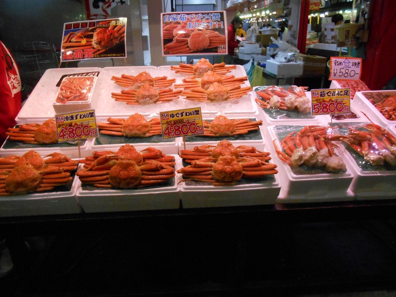 子どもが帰省するので、買い物にいきました。いろいろな海産物がやもとあり、どれにしようか迷いました。かにもいろいろなお店に、何軒もならんでいて、どのお店のものがいいのかわかりません。お店の人の一声で買いました。