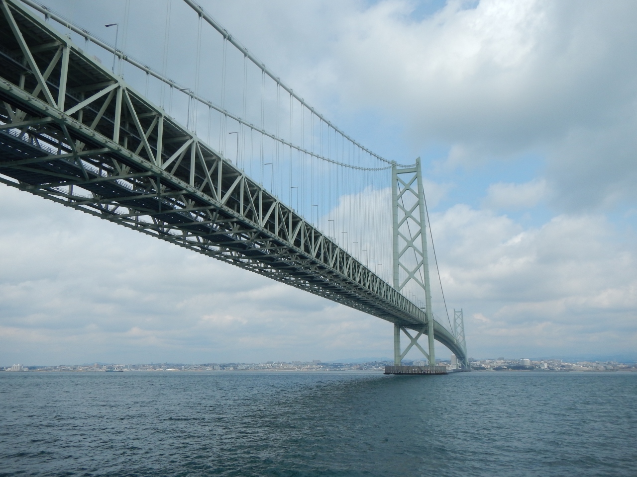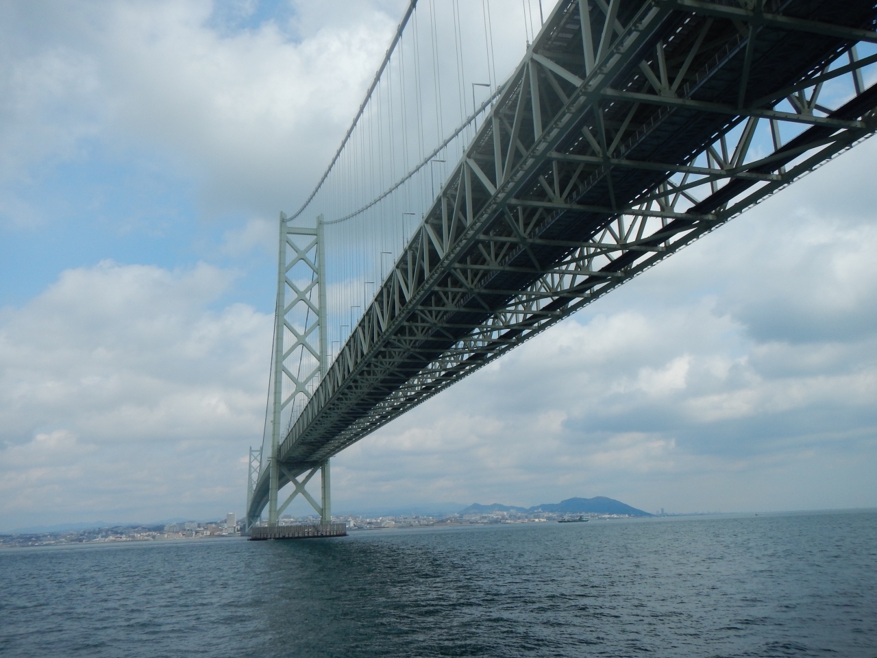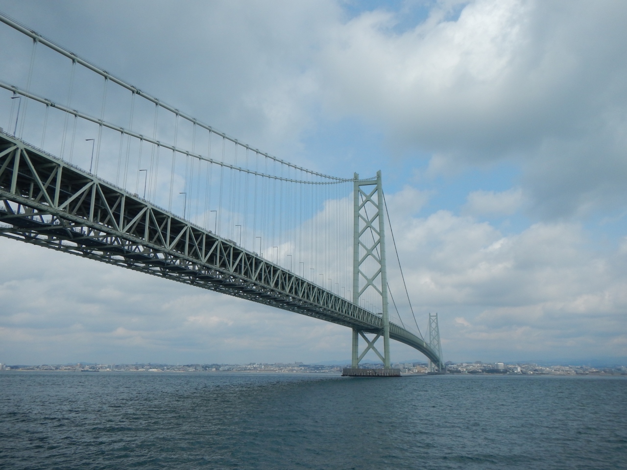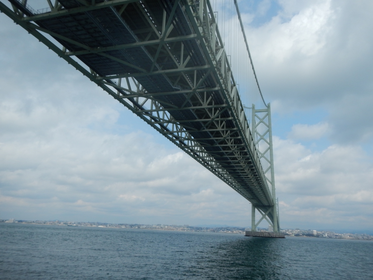 2015年3月淡路ジェノバラインで、早春の明石海峡大橋をくぐってきました。遠くから見ても、この橋のすごさはわかりません