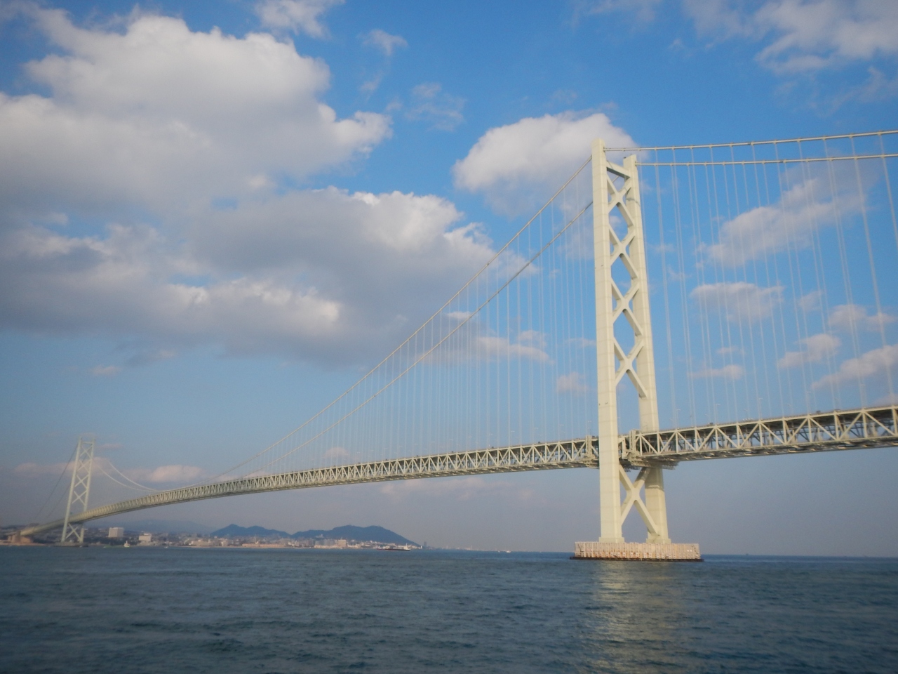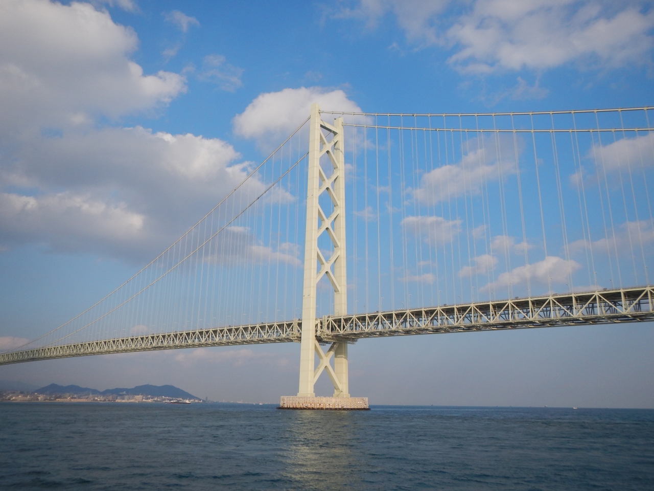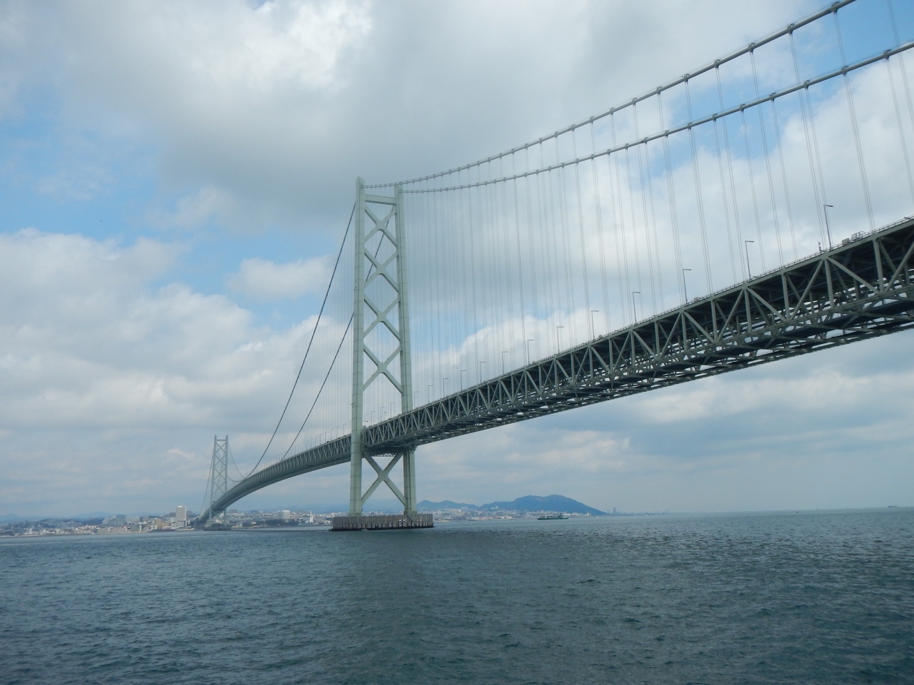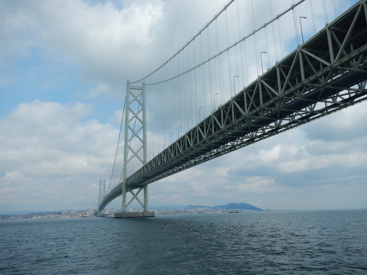 2015年3月淡路ジェノバラインで、早春の明石海峡大橋をくぐってきました。遠くから見ても、この橋のすごさはわかりません