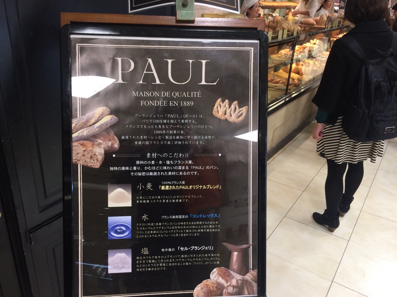 近いには食品街がありますが、フランスのベーカリーPAULが入っていて、ちょっと驚きました。今年の正月にシャルル・ド・ゴール空港で入った店ですが、日本に進出しているとは知らなかったです。