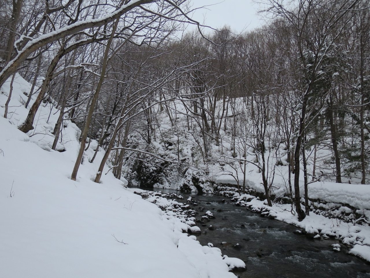 滝を見るには、バスも通る手稲西小・中学校の前の道路から沢へ下る細道を星置川まで下り、再び岩の壁を登ったところから眺めます。道路から150mとのことです。もう少し近くから見てみたい気もしますが、本当に岩が切れ込んだ崖になっていて、それ以上進むのは大変危険です。川を遡上するにも、切れ込んだ崖がそのまま深い淵になっていて、肩ぐらいまである長いつなぎでも着ないと、濡れずにたどり着くのは不可能です。