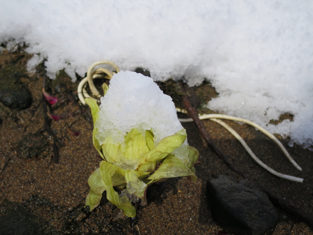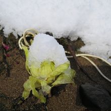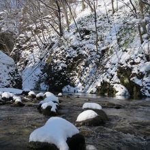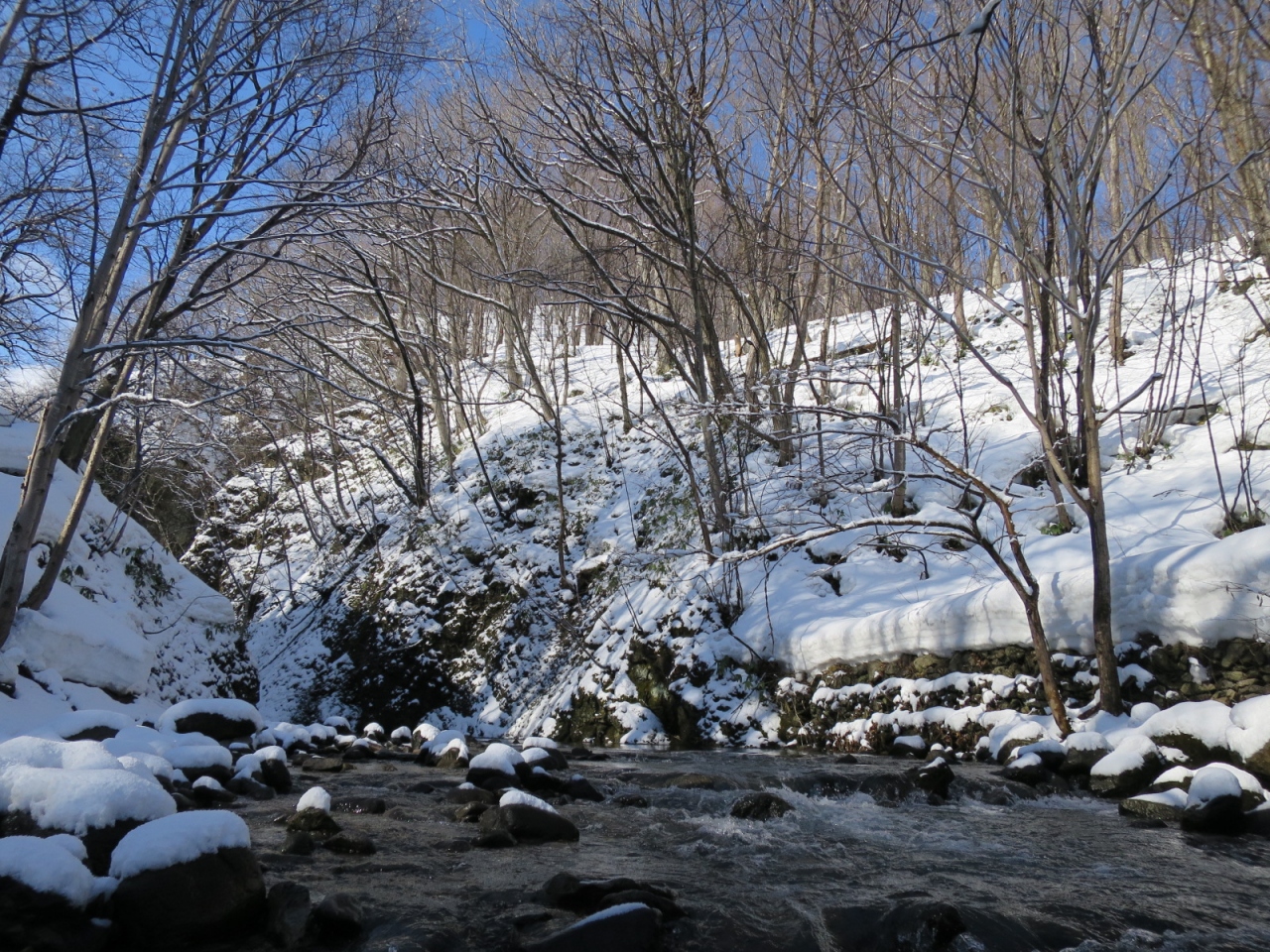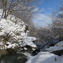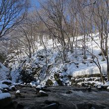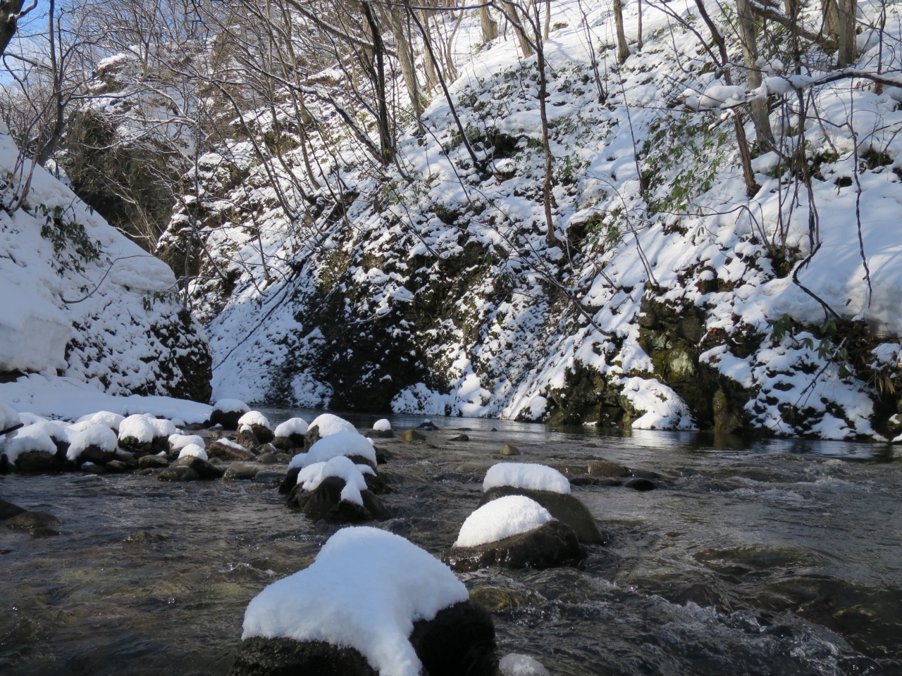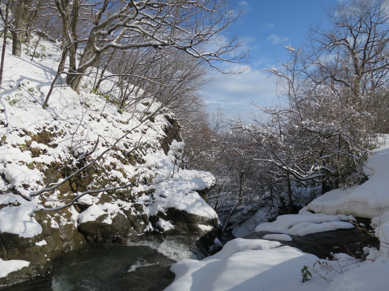 冬は深々と雪が積もっていますが、長靴があれば見晴らし台まで行けないこともありません。ただし、滑落には要注意です。