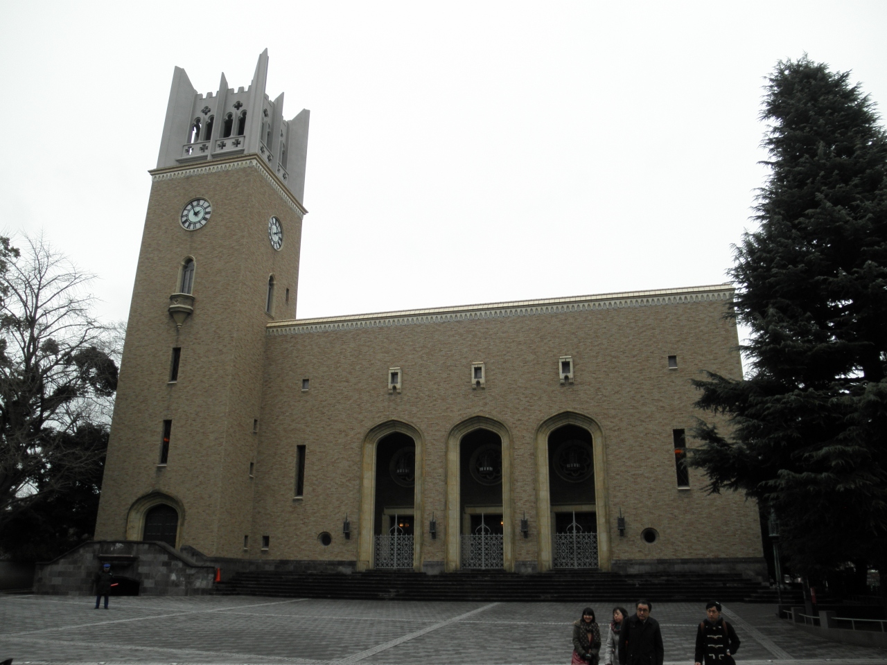 早稲田大学の早稲田キャンパスの正門のすぐ外側に大隈重信像と並び大学を象徴する大隈記念講堂がありました。テレビなどで見ていた通りの威厳を感じさせる大きな講堂で時計台もありました。重要文化財に指定されているそうです。