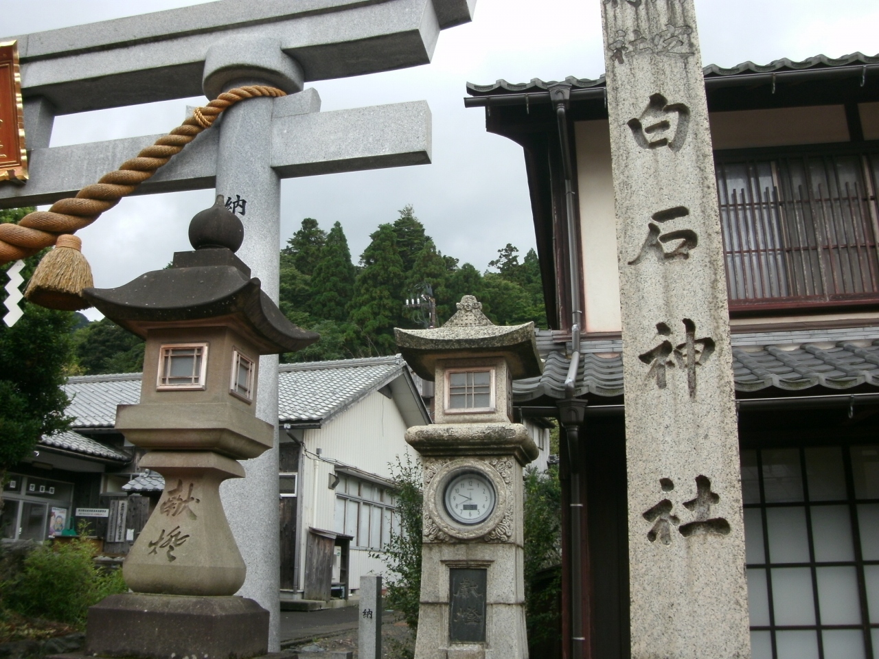 道沿いの参道入り口にある鳥居のそばに、時計を組み込んだ珍しい石灯籠があります。その先、山道を進み階段を登ると本殿が見えてきます。
